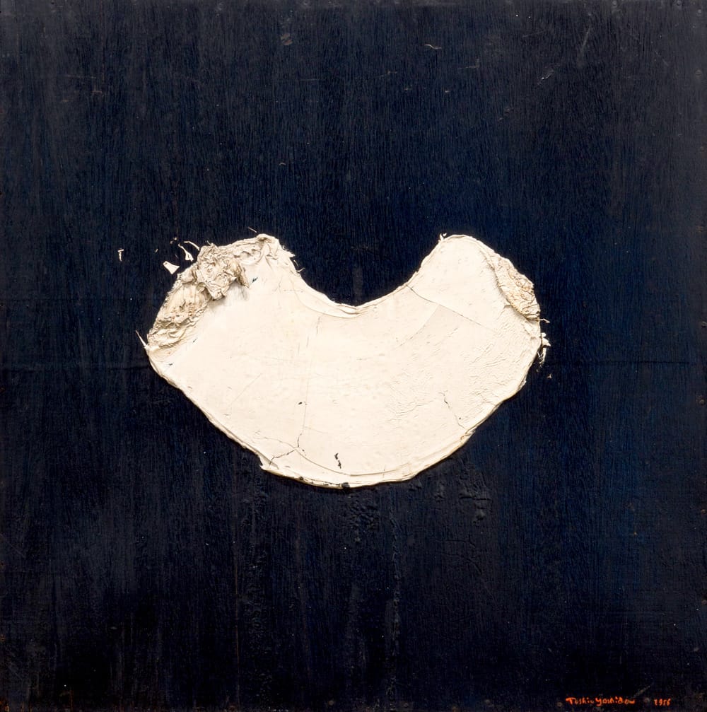 In “Sakuhin (56-12)” (oil on board, 1956), Yoshida calls attention to the inherent physical character and expressive potential of his material with a thick, broad, elbow-macaroni-shaped stroke of creamy-white oil paint on a square, black ground. His mark lies there in a void — one can imagine it stretching out endlessly on all sides — as if to declare, “I, a single brushstroke, am alpha and omega, the beginning and the end of any painting, the first and the last element of any painted image.”