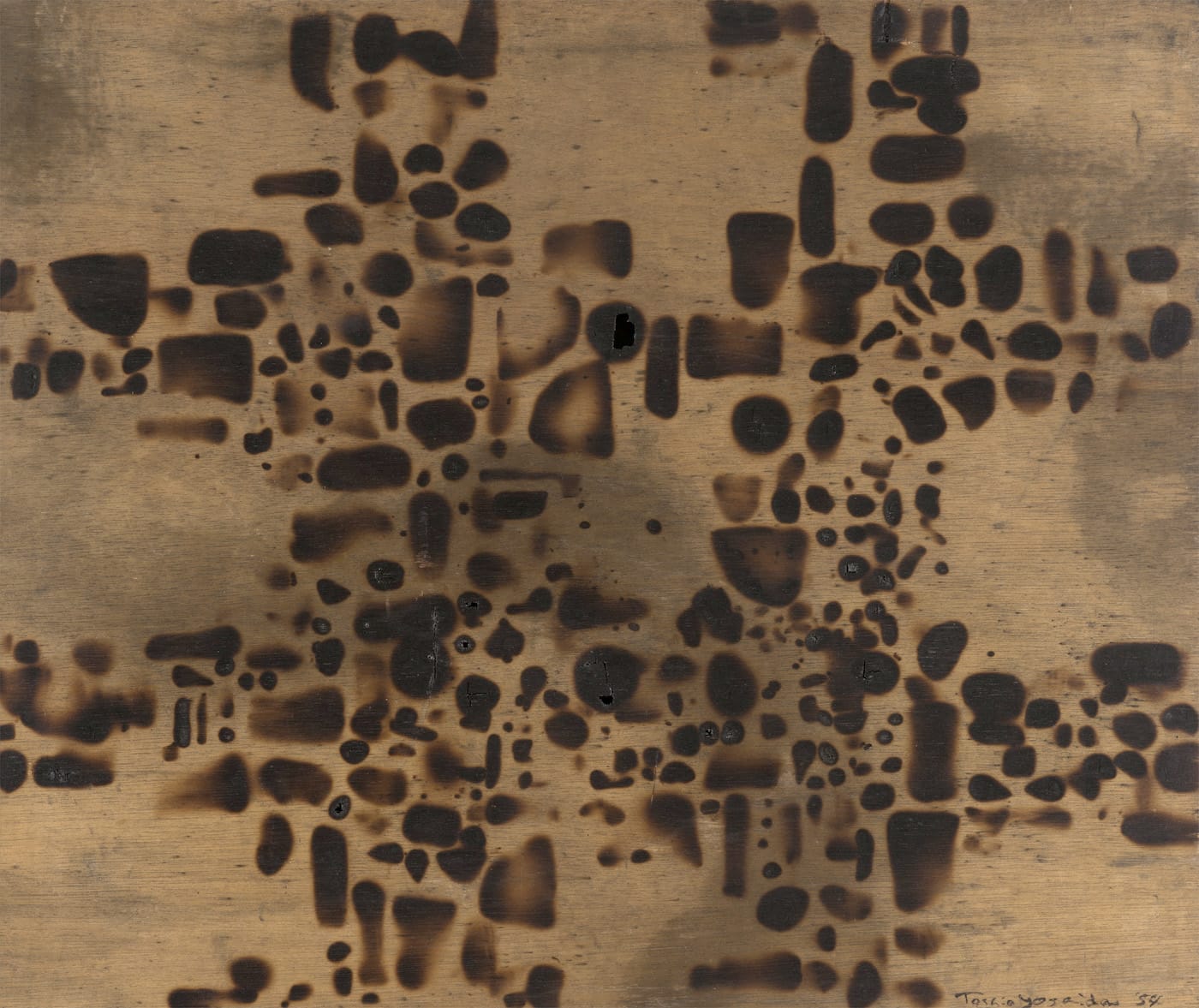 In some of Yoshida’s earliest works, from 1954, the artist gave tangible form to the Gutai spirit by pressing hot coals or a soldering iron against the surfaces of wood panels to make “burn paintings.” (Like many Gutai works, most of Yoshida’s creations are untitled or simply bear the Japanese name “Sakuhin,” meaning “Work,” and a number.)
