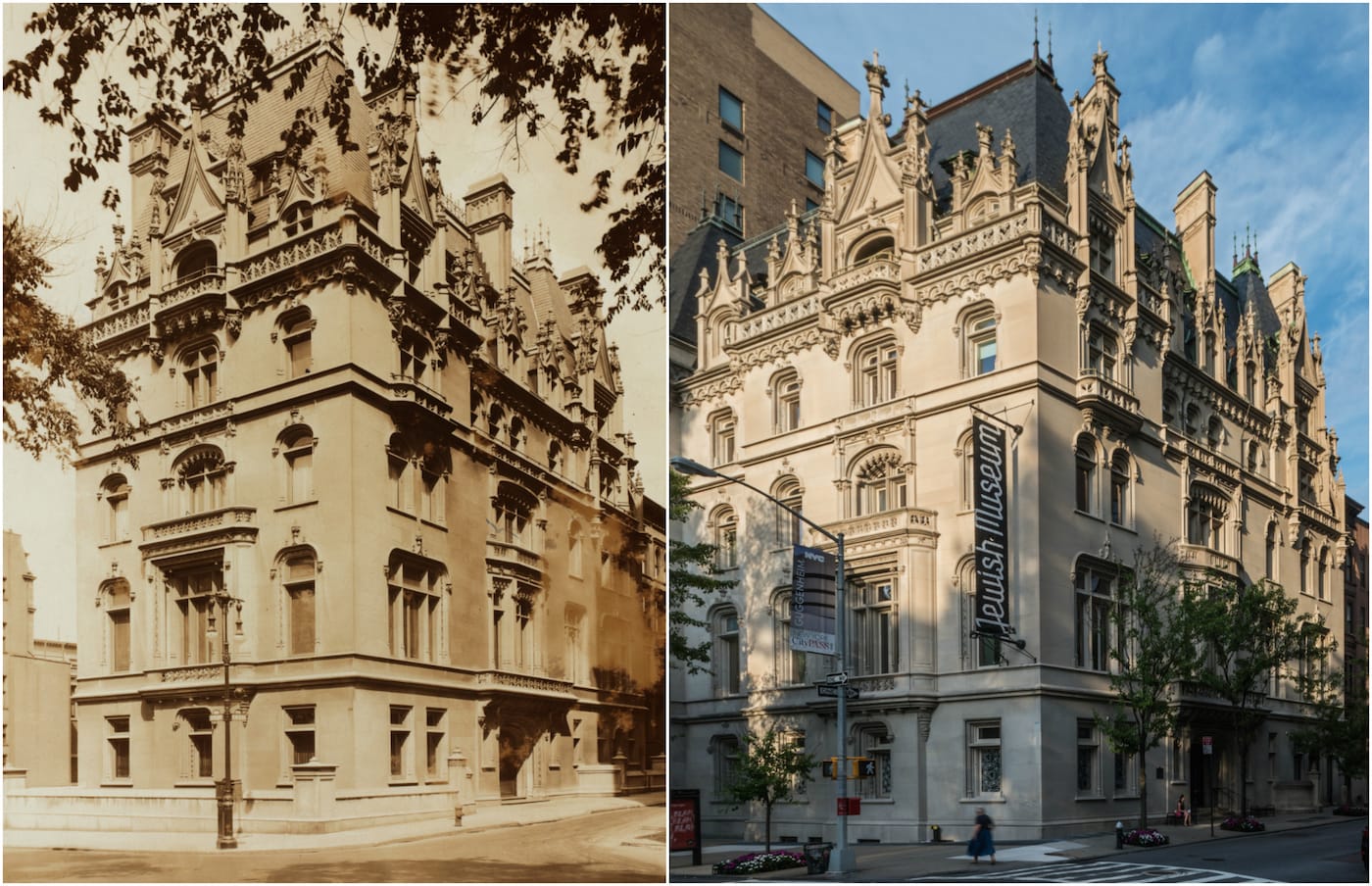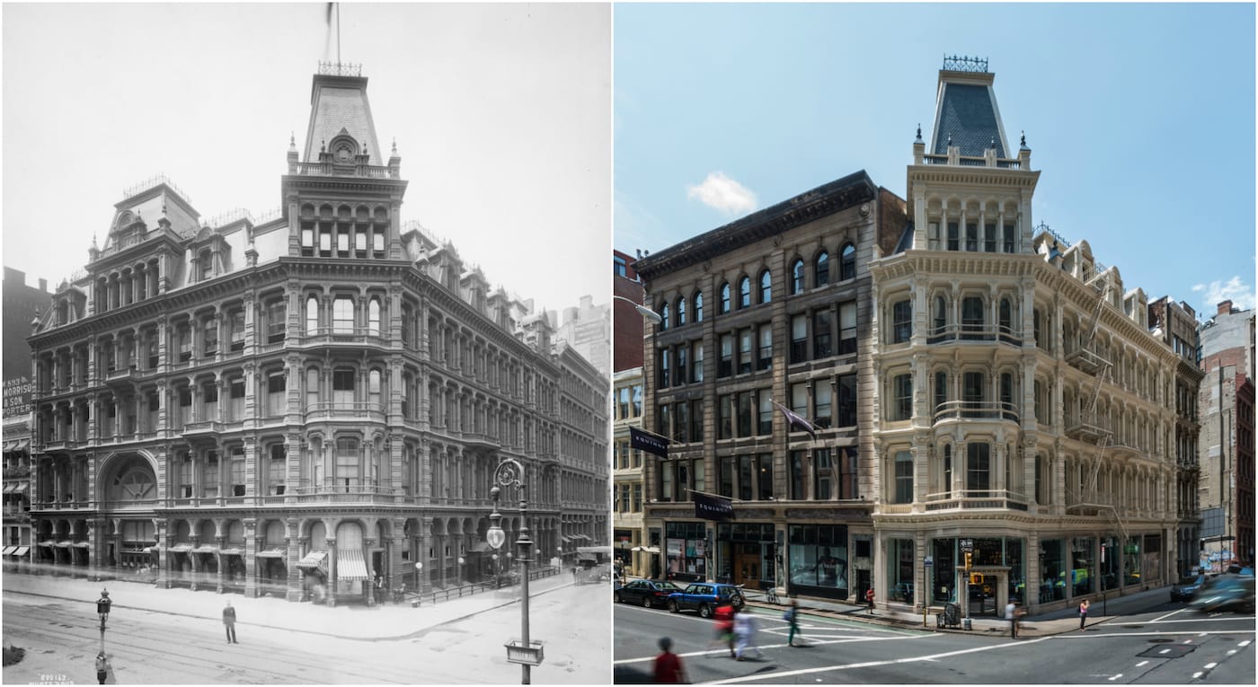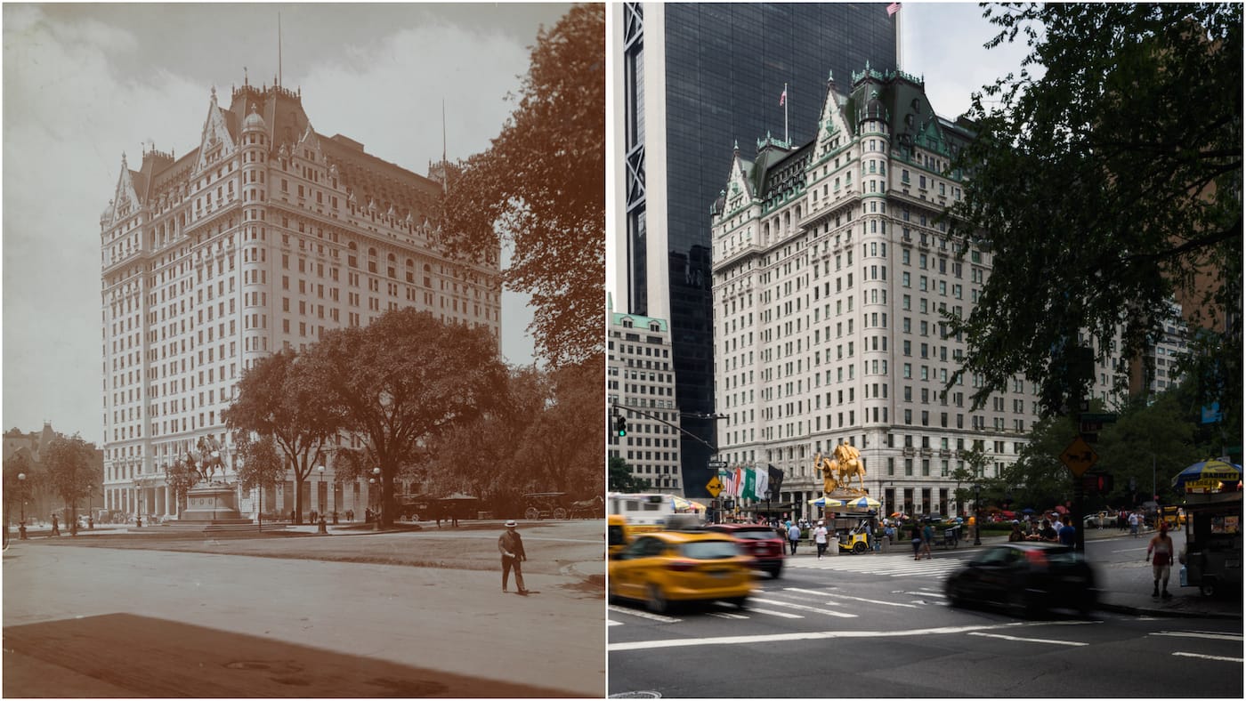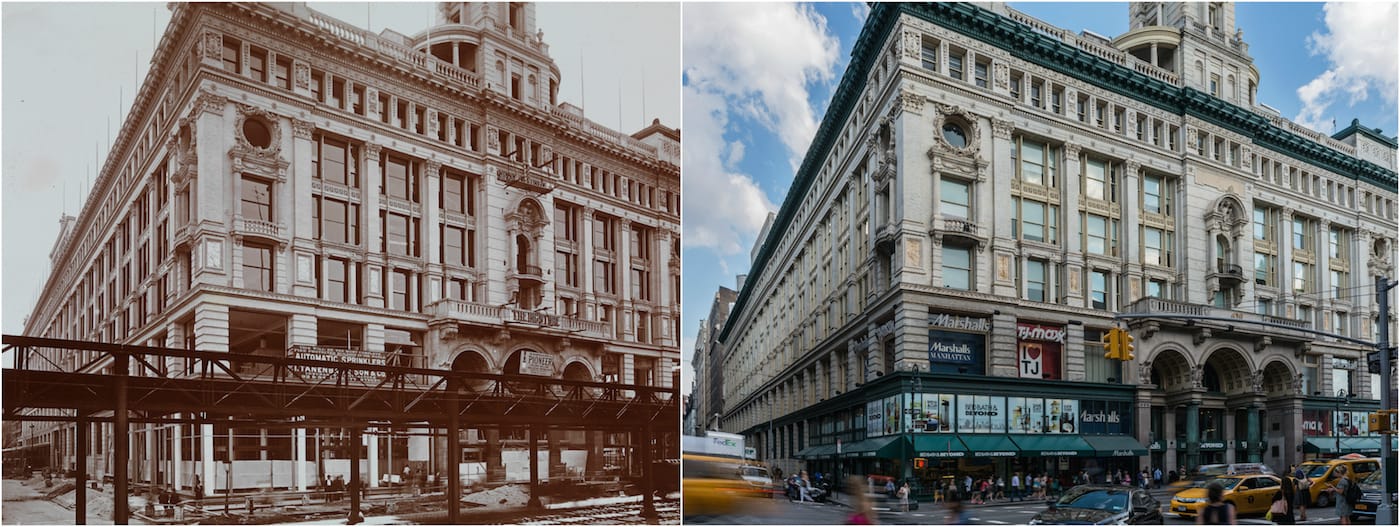 While some of the lush (and tawdry) cultural venues and Fifth Avenue millionaire mansions are now gone, such as the demolished 1882 Vanderbilt House, many are transformed. The app highlights structures like the Jewish Museum that was constructed as the Felix Warburg house, and notes that even as a private home it was something of an art gallery with its collection of Rembrandt and Cranach etchings. Recent photographs by Harlan Erskine are compared to archival images from MCNY and other institutions, demonstrating the shadow of a skyscraper now towering over the Plaza Hotel, and the fall of the elevated El tracks outside the Siegel-Cooper department store (now home to Bed, Bath & Beyond, Marshalls, and T.J. Maxx).