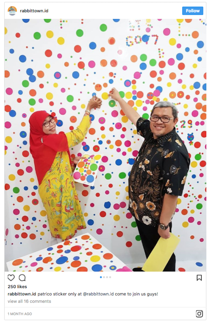 “Urban Lights” is one of the most photographed sites in Los Angeles, and one of the most widely recognizable works of contemporary art in the world. So is Yayoi Kusama’s “The Obliteration Room” (2002–present), a copy of which is also on view at Rabbit Town. Dubbed “Love Lock,” the Bandung version invites visitors to do exactly what Kusama asks of those who enter her installation, which begins as an entirely white, furnished room: cover it in colorful stickers that resemble polkadots. David Zwirner, which represents Kusama, did not return Hyperallergic’s requests for comment.