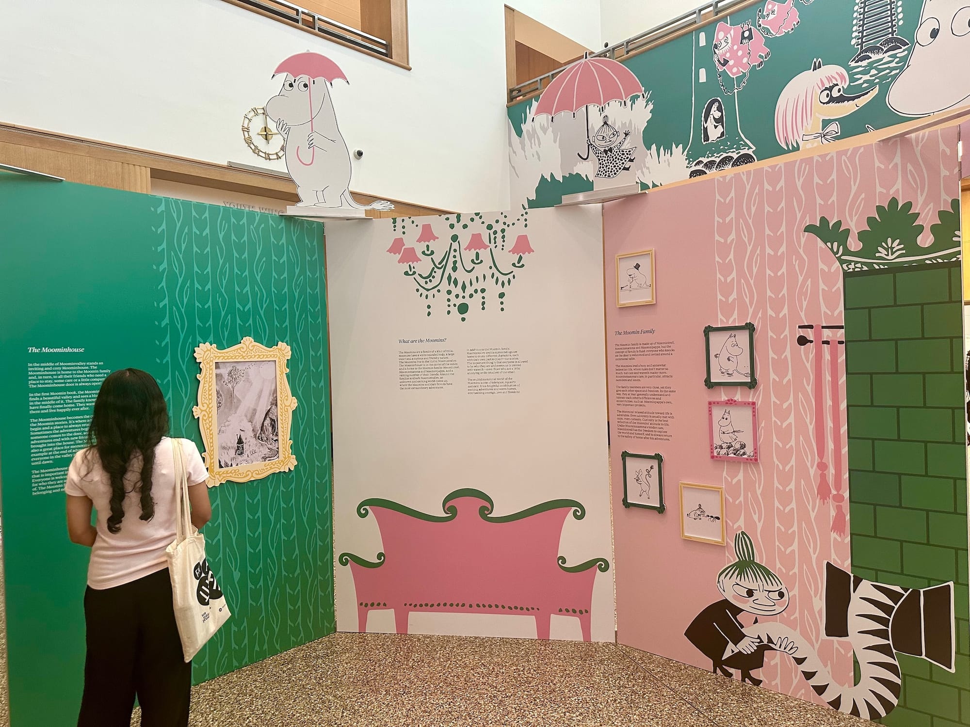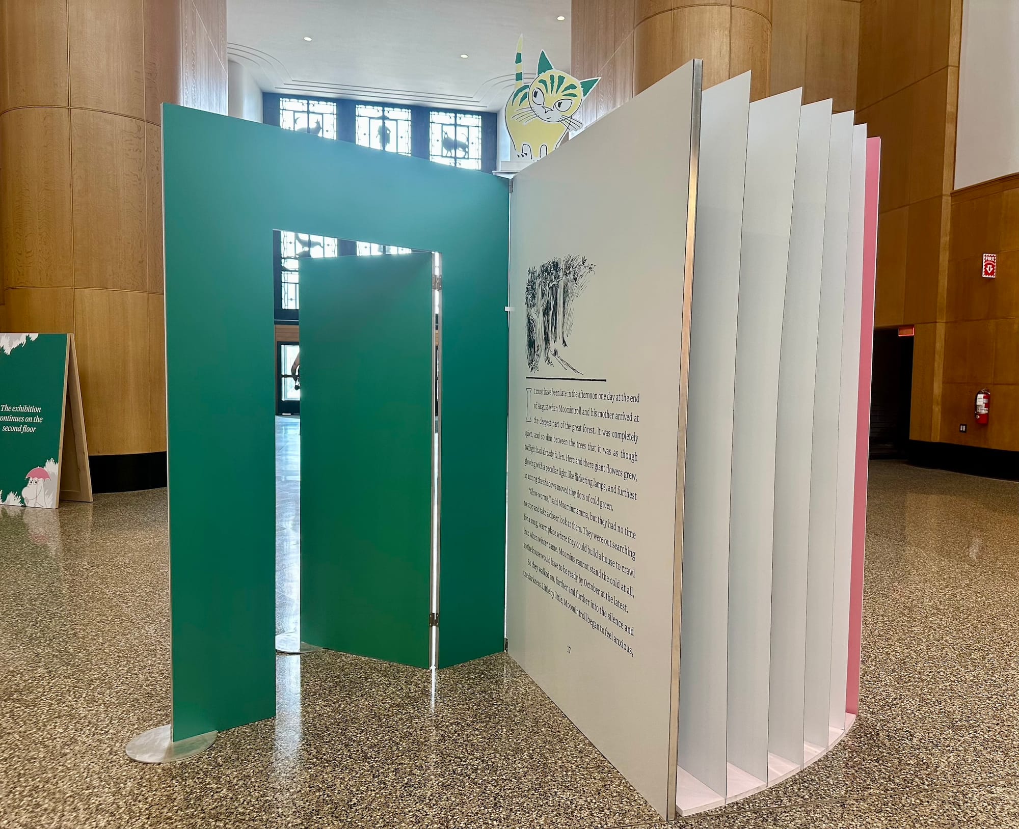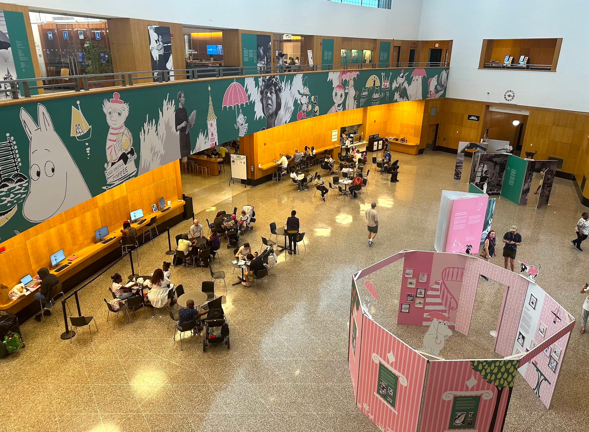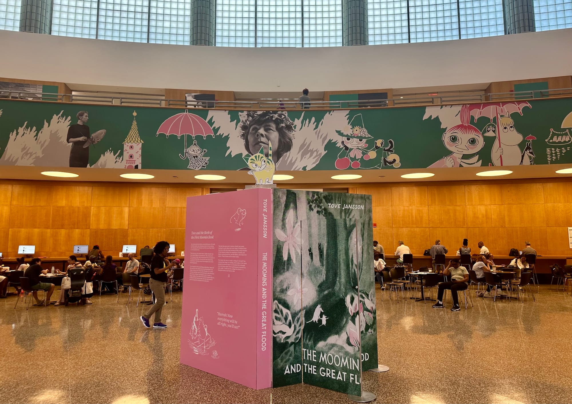 Libraries are public spaces first and foremost, something Jansson believed in deeply — so it’s only fitting that The Door Is Always Open weaves its way through the very fabric of community at the Central Branch. Installations explaining her career and the genesis of the series dot the airy lobby, emphasizing the trolls’ appreciation for the natural world, equality, and individuality. The installations were cleverly designed to alternately resemble a chapter book, an unfolding accordion of pages, and even a living room from the trolls' home in Moominvalley. Visitors can step into the free and adventurous everyday world of the Moomins, from the idiosyncrasies she bestowed on each character (Snufkin loves to play the harmonica and spend time alone) to the carefully designed Moominhouse (whose door, as the exhibition name suggests, is always open). Librarygoers wandered past and through the installations, while students typed away on laptops and families rested at the cafe, a scene that I suspect would’ve made the artist smile.