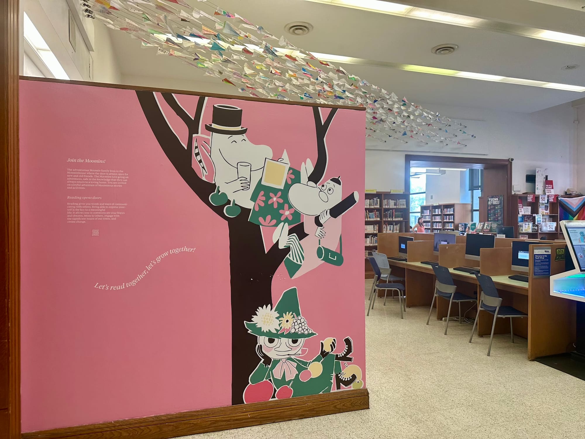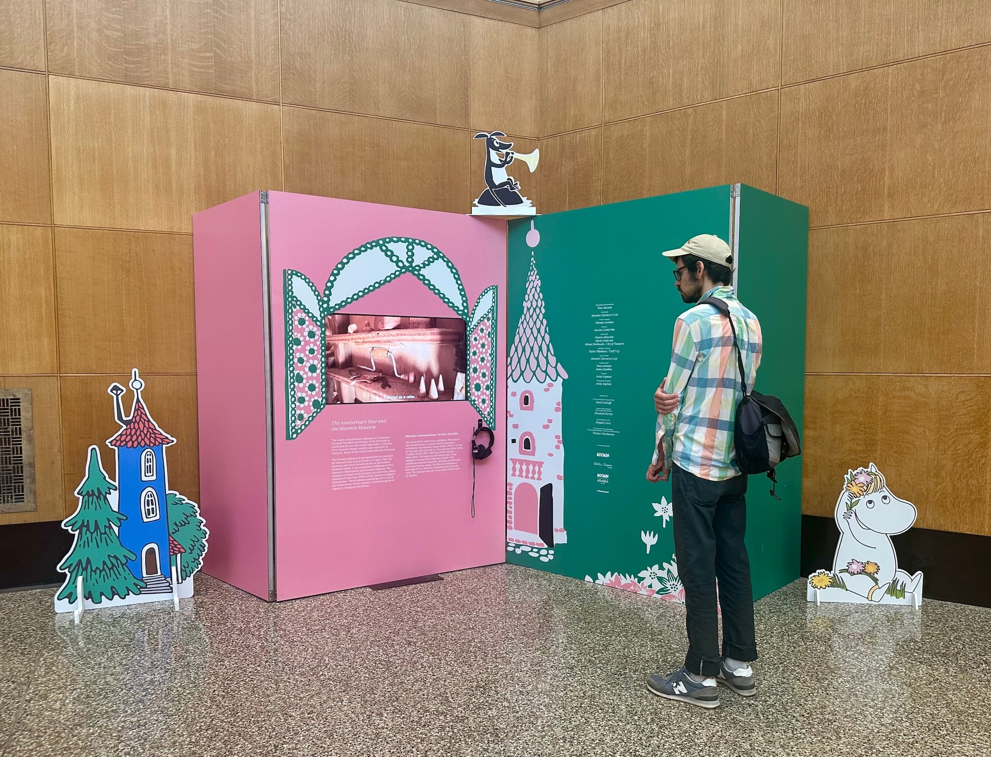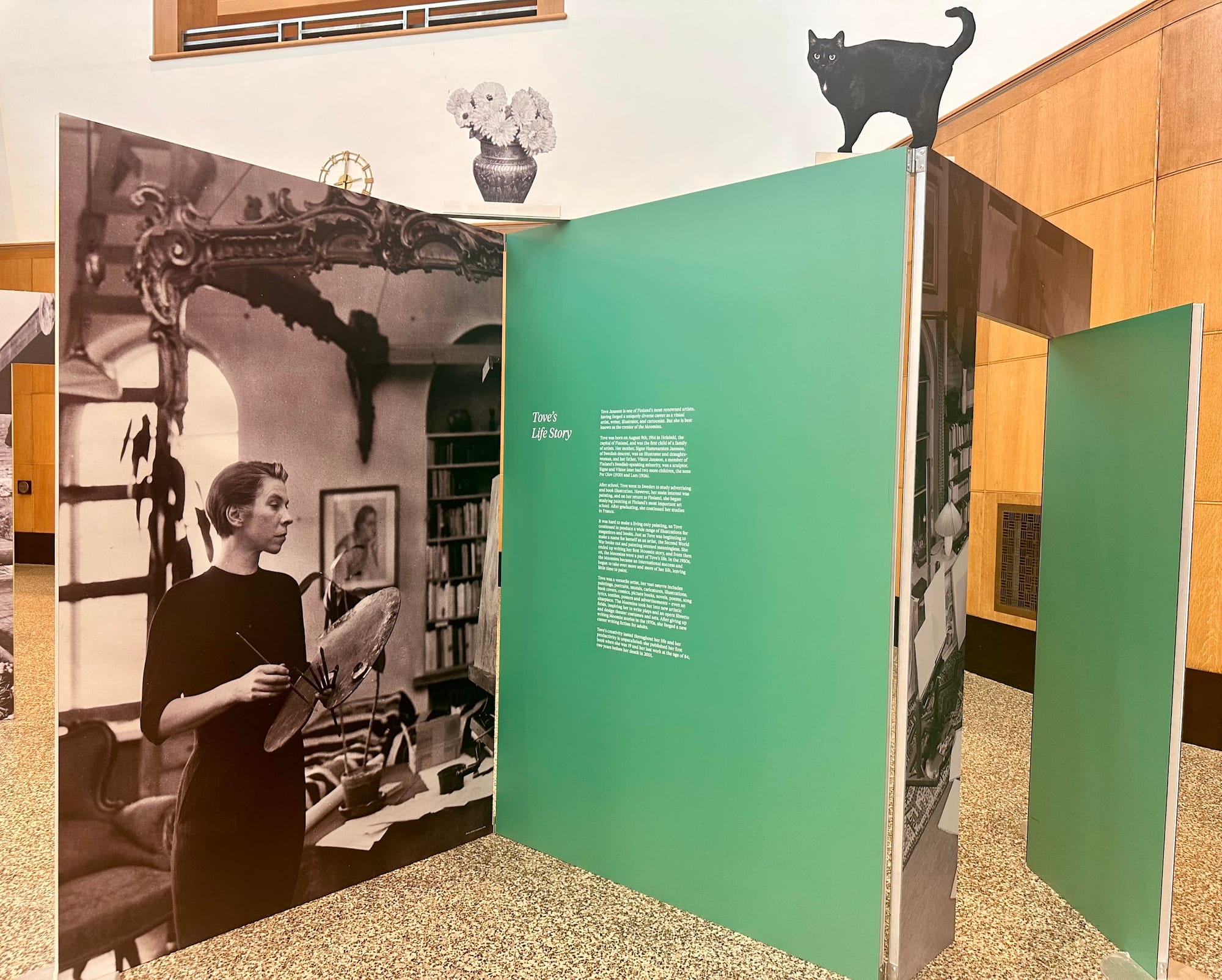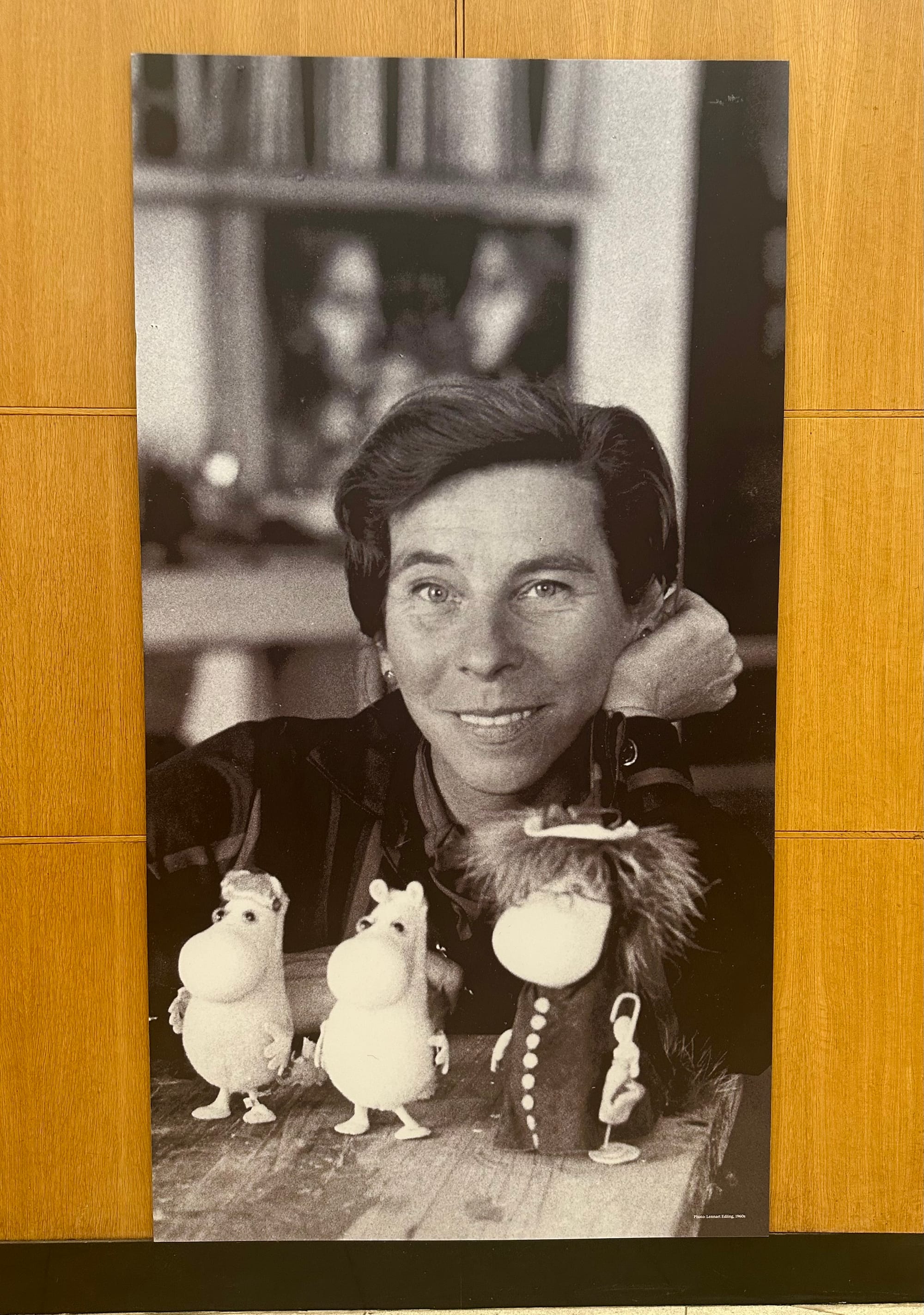 Libraries are public spaces first and foremost, something Jansson believed in deeply — so it’s only fitting that The Door Is Always Open weaves its way through the very fabric of community at the Central Branch. Installations explaining her career and the genesis of the series dot the airy lobby, emphasizing the trolls’ appreciation for the natural world, equality, and individuality. The installations were cleverly designed to alternately resemble a chapter book, an unfolding accordion of pages, and even a living room from the trolls' home in Moominvalley. Visitors can step into the free and adventurous everyday world of the Moomins, from the idiosyncrasies she bestowed on each character (Snufkin loves to play the harmonica and spend time alone) to the carefully designed Moominhouse (whose door, as the exhibition name suggests, is always open). Librarygoers wandered past and through the installations, while students typed away on laptops and families rested at the cafe, a scene that I suspect would’ve made the artist smile.