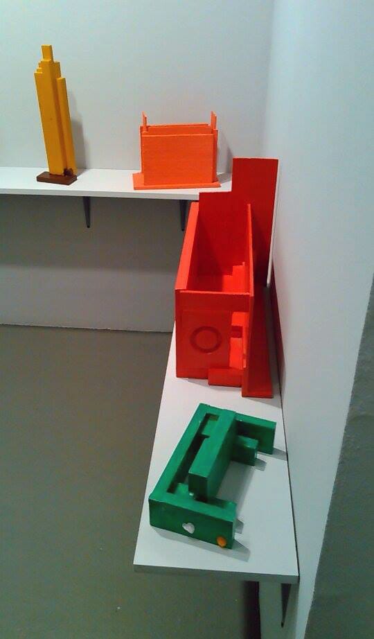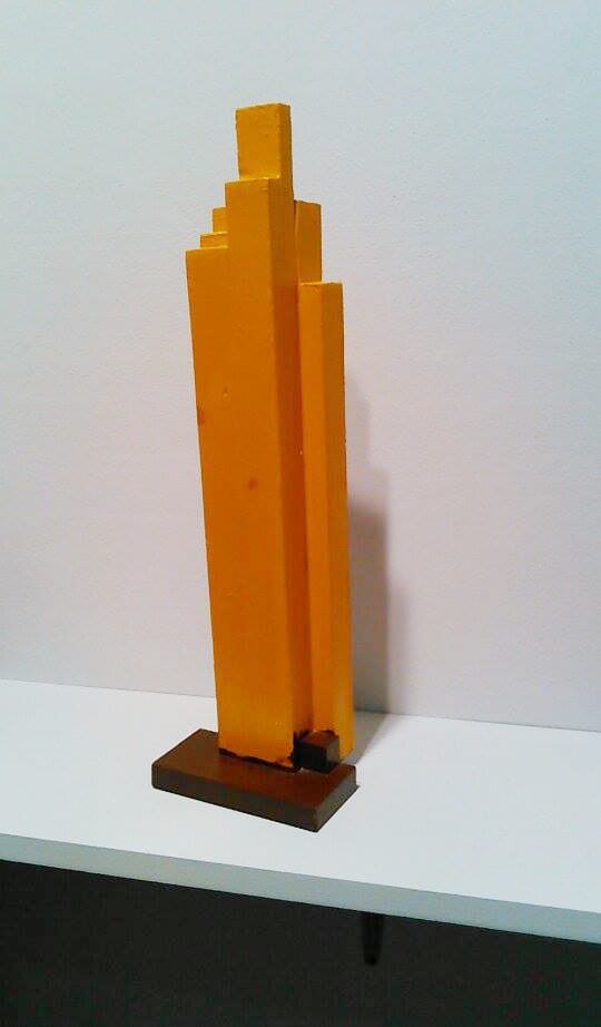 His works are not about particular buildings and are not maquettes, but instead have an uncanny effect of evoking the psychological space of architecture without actually being about architecture. For example, one tall work is made up of long, rectangular slats glued together unevenly and then set onto a base that doesn’t quite fit. It’s painted a solid umber color and although it resembles a skyscraper in form, there are no doors or windows. In other words, there’s no way in and there is no way out.