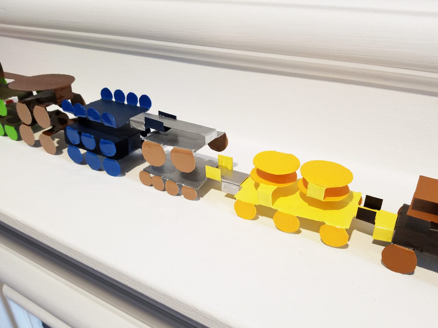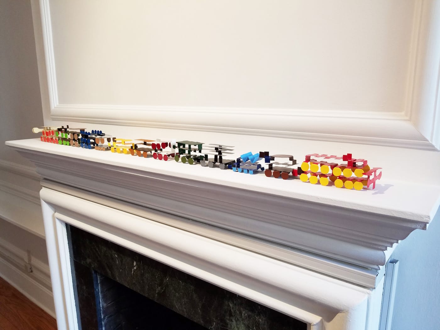 Lined up atop this townhouse gallery’s fireplace mantle is a 55-inch-long concatenation of a dozen or so cars, variously configured and colored but made in the same ad hoc, antiheroic manner as the works on the big table. Identified as a single piece but clearly composed of distinct sections, it is a witty twist on the show’s parts-to-the-whole conceit. It is also the most easily labeled object in the show, quite clearly a train with a big red engine.