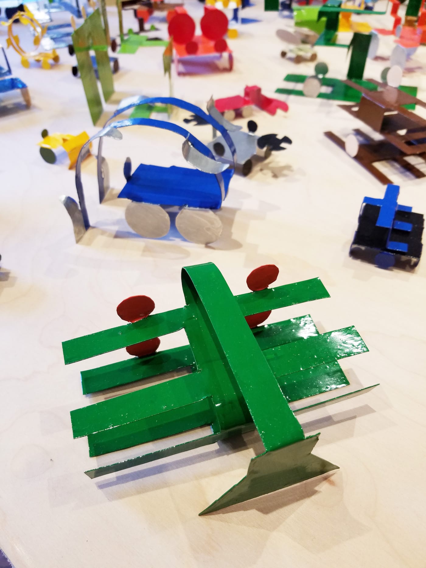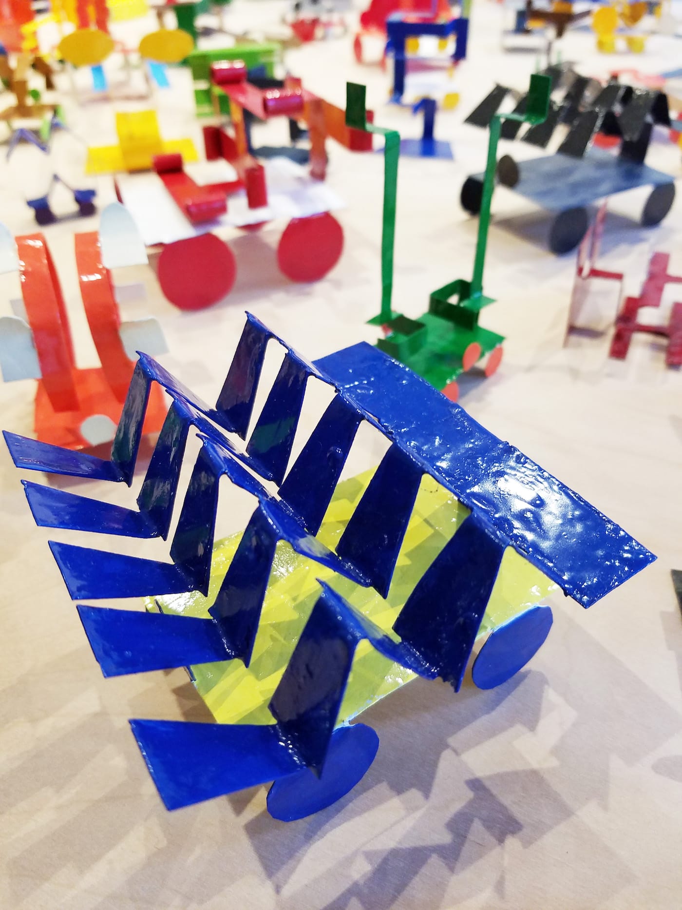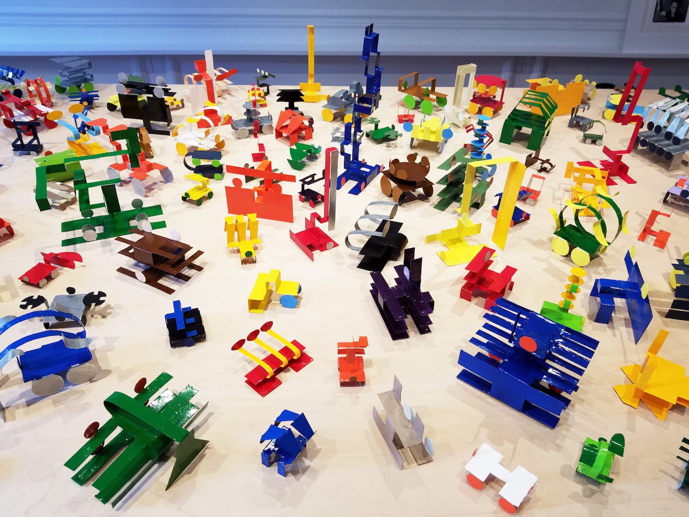 There’s a lot to look at in Chris Macdonald: Recent Sculpture, on view through October 21st at Anders Wahlstedt Fine Art, even though the exhibition covers just a few square feet. That’s because the show’s approximately 135 works — ranging from quite small to minuscule — are distributed across a single table in the middle of the gallery’s main space. They are made of galvanized sheet metal that has been snipped and folded into freestanding objects resembling toys, and finished with vibrant enamel paint in saturated colors. Individually and collectively, they are delightful, and provide a lot to think about, too.