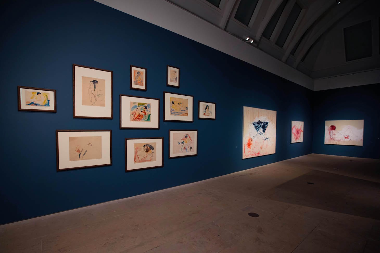 Though Munch’s scaled-up work is sparsely represented, a large cluster of smallish paintings of female nudes is on display in the first gallery. These small nudes provide a model for Emin’s self-representations, the way they lay, as if on a slab, curled into a fetal position.