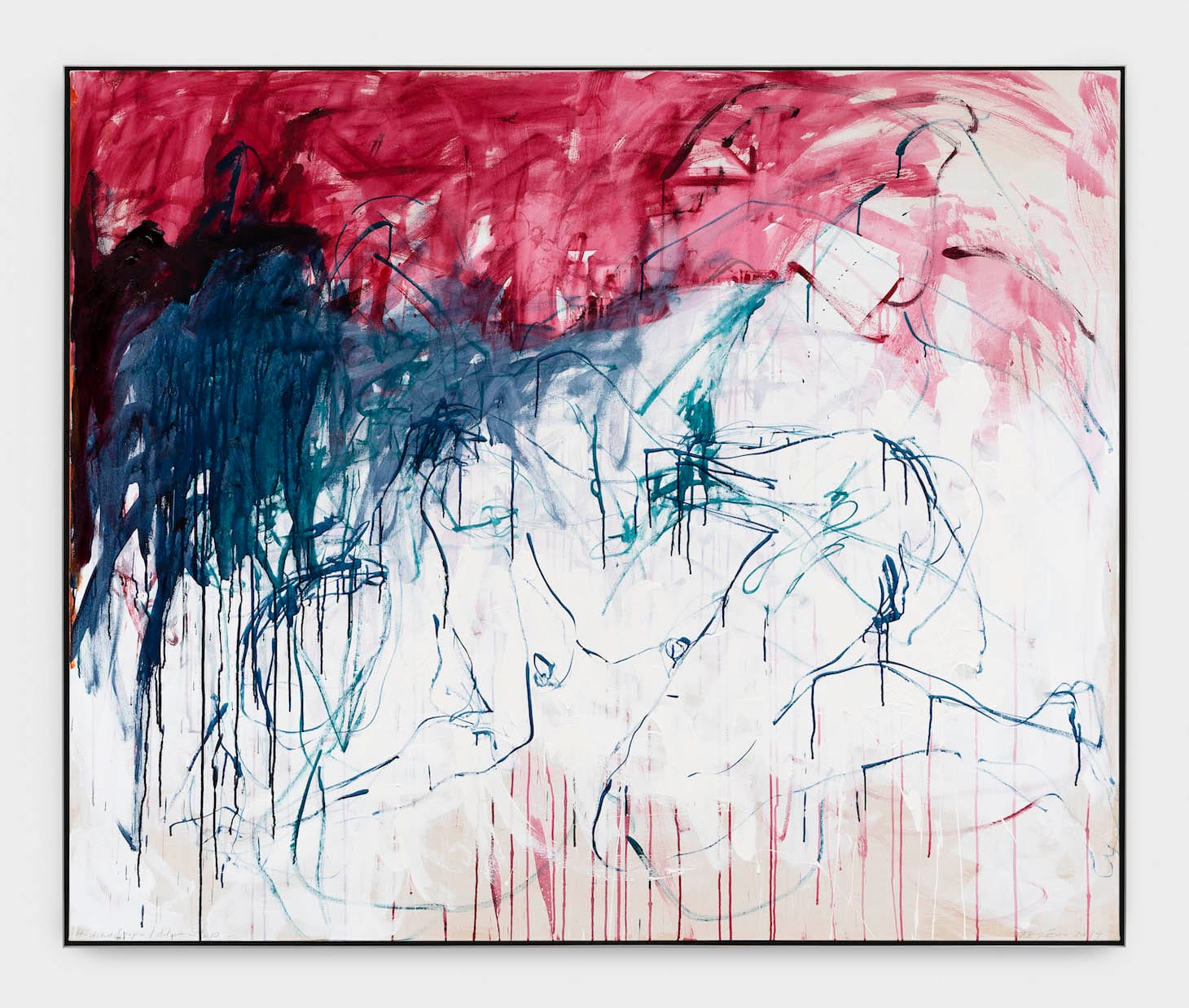The red pigment streams and welters to such an extent that it brings to mind a line by the Elizabethan playwright Christopher Marlowe: See, see where Christ's blood streams in the firmament! Emin's painted strokes, scribbled, slashed, or left to drip, look feverishly provisional, as if no procedure involving hand and eye could capture quickly enough what she is trying to bring to birth. Her drizzling of paint is reminiscent of Munch's open-mesh brushstrokes, his bodies made of lines and smears and stains.