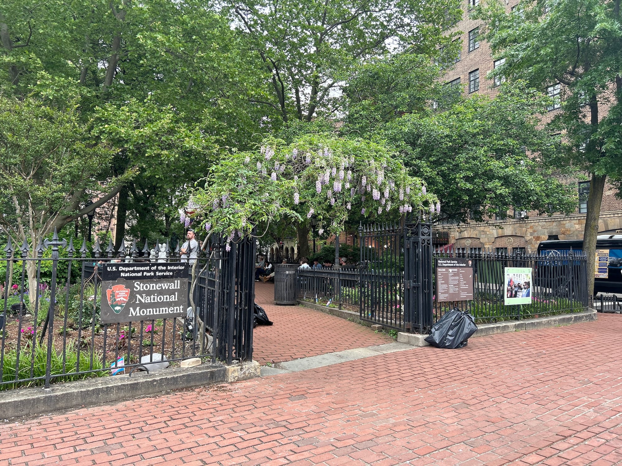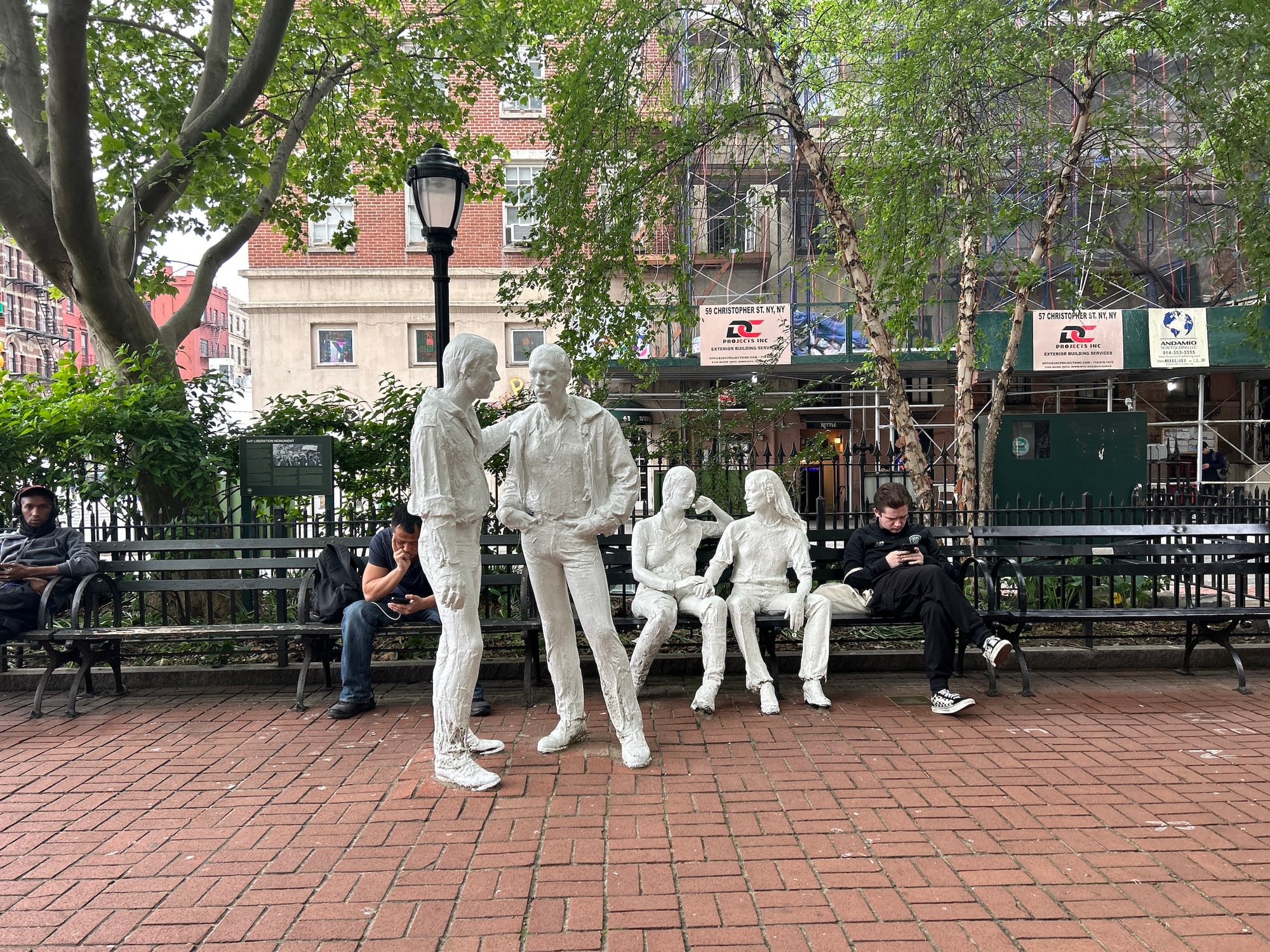 Before the 1969 Stonewall uprising, Christopher Park, the small triangular green space directly across from the famous inn on the corner of Seventh Avenue, was long a shelter for queer and gender non-conforming youths (many of whom were unhoused) escaping violence and abuse they experienced at home or on the streets. On the night police raided the Stonewall Inn, it became a refuge for protesters, who formed kick lines and sang humorous songs to taunt officers. And during the peak of the riots, the park was swarmed with several thousand people who had taken to the streets to confront police. In the aftermath, the park endured as a symbol of LGBTQ+ activism, hosting demonstrations led by newly formed groups like the Gay Activists Alliance and the Gay Liberation Front. It was also where LGBTQ+ rights advocate and Stonewall leader Marsha P. Johnson could often be found panhandling for funds that would usually be redistributed to those in need.