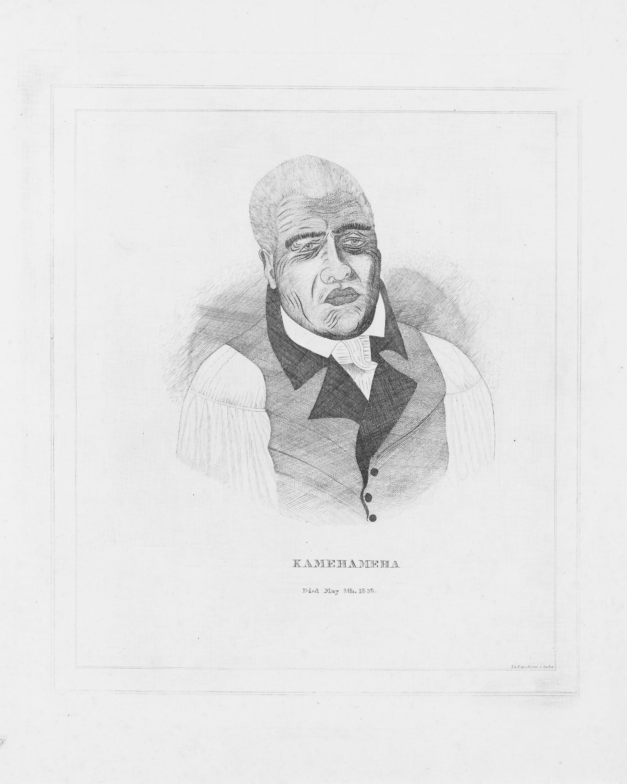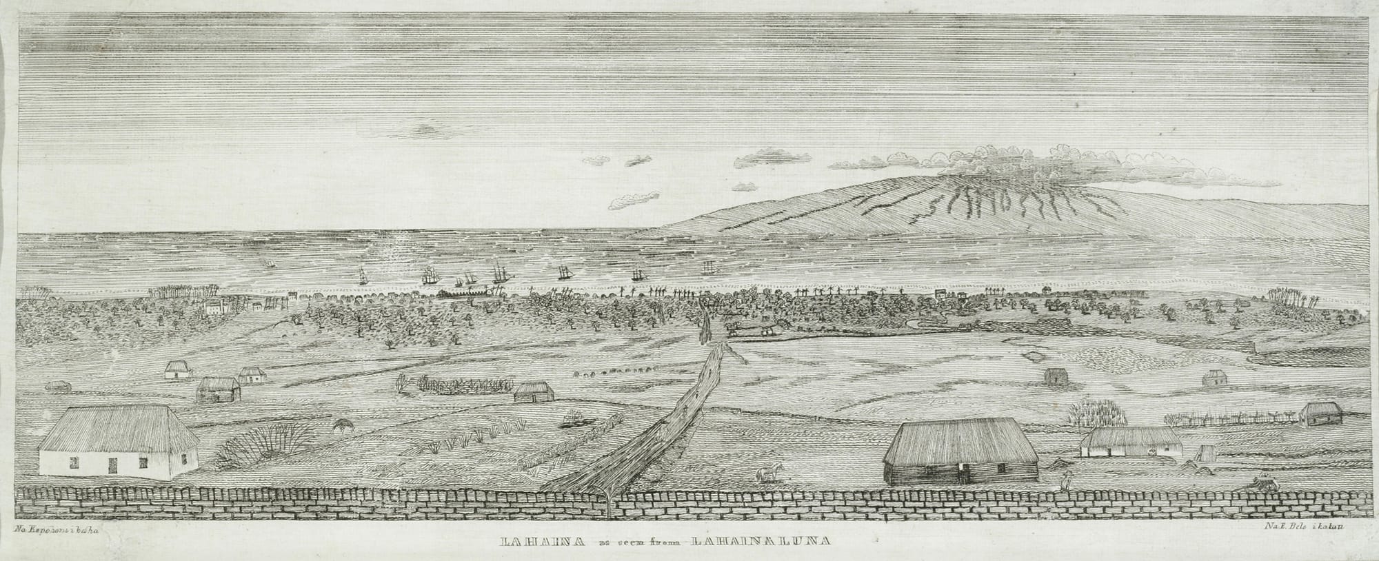 Perhaps the most important coalescence between haole and Hawaiians, however, is in work produced at the printing press at the American Protestant seminary built in the hills above Lahaina called Lahainaluna. A rare body of copperplate engravings made between 1834 and 1844 were executed there by Native Hawaiian (Kanaka Maoli) students from drawings made by haole men and women, the images range from majestic land and seascapes to portraits of Hawaiian notables, as well as atlas maps and animals for Hawaiian language primers. The etchings struck in the Hale Pa'i (printing house) were used in schools across the islands attended by Native Hawaiian adults and children, operated by the network of mission stations. Today, they survive as engrossing renderings of scenery and an environment long ago supplanted by agribusiness, unbridled development, and ecological collapse, their simple visual allure loaded with nostalgia and romance.