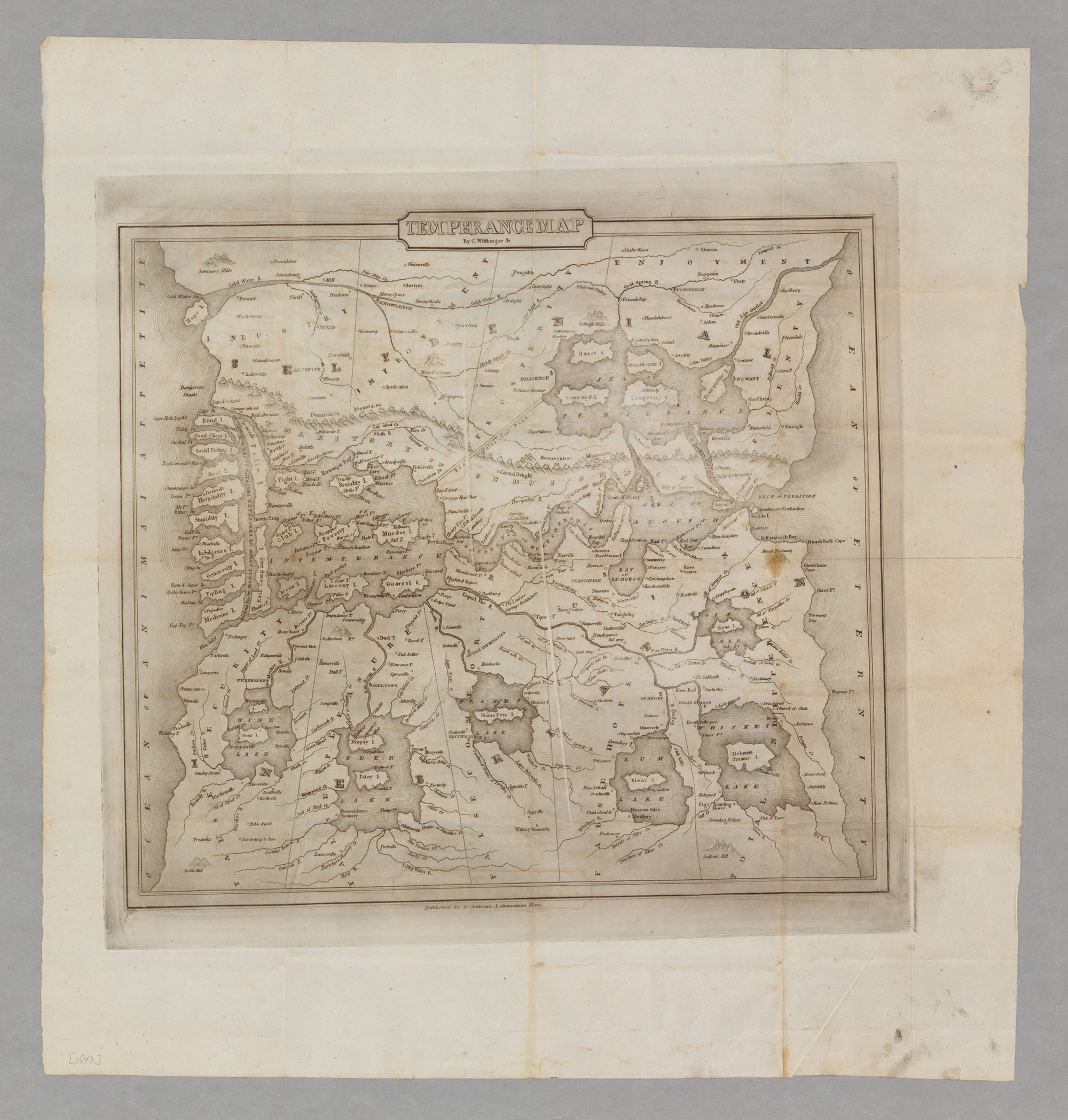 While the Hawaiian engravers excelled with panoramas, the smaller-scale engravings, including flat portraits of Kamehameha and Queen consort Kamamalu, botanical prints, renderings of the various mission buildings on Maui, Oahu, Hawai′i Island, and Kauai, were ruder. The atlas prints on the other hand are remarkably accurate for their day, all copied or traced from existing sources in the missionaries' personal libraries. The oddest picture in the body is the "Temperance Map" (1843), an imaginary land composed of Whiskey Lake, Delirium Tremens Island, and the Bay of Remorse south of a demarcation, with the territories of Enjoyment, Improvement, and Industry to the north. The printers at Lahainaluna were also commissioned to make currency, a practice that lasted until two students were caught counterfeiting bills and expelled from the seminary.