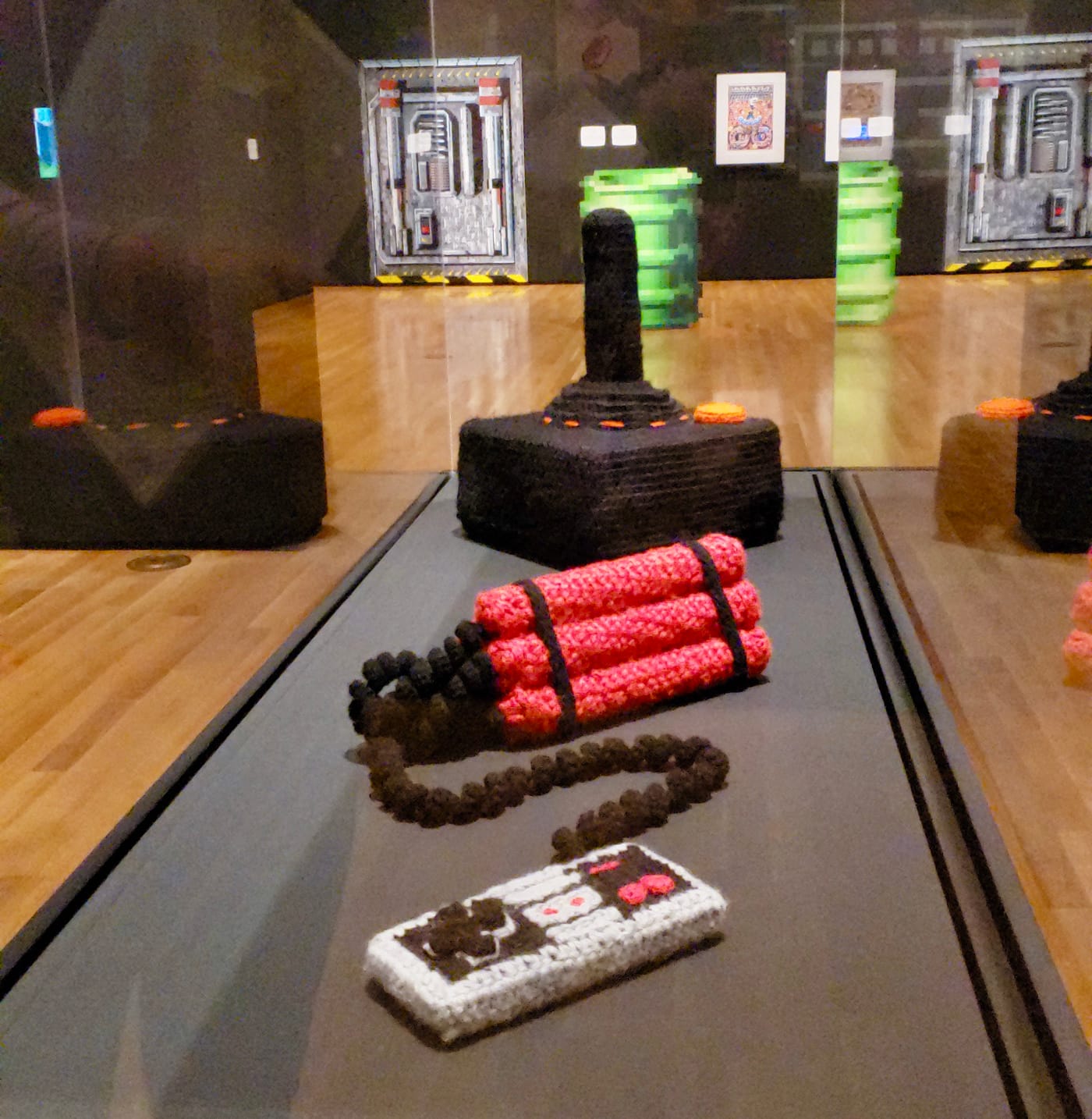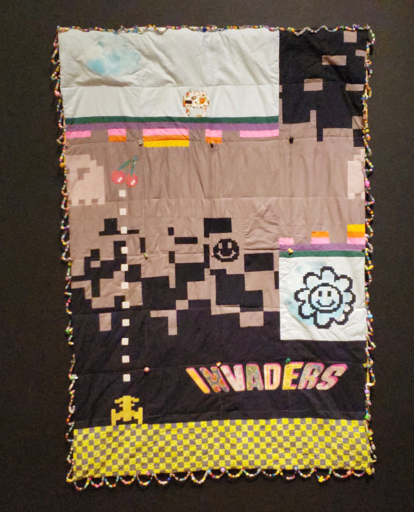 The non-virtual objects in Open World include yarn console controllers by Nathan Vincent; brilliant fiber works by Krista Hoefle that translate the bit-forms of early arcade games into the geometric construction of quilts; and teeth-grindingly detailed ballpoint pen drawings on paper by Butt Johnson that illustrate game worlds, architecture, controller devices, and characters in epic high fantasy detail. But I’ll leave it to you to explore the full measure of Open World.