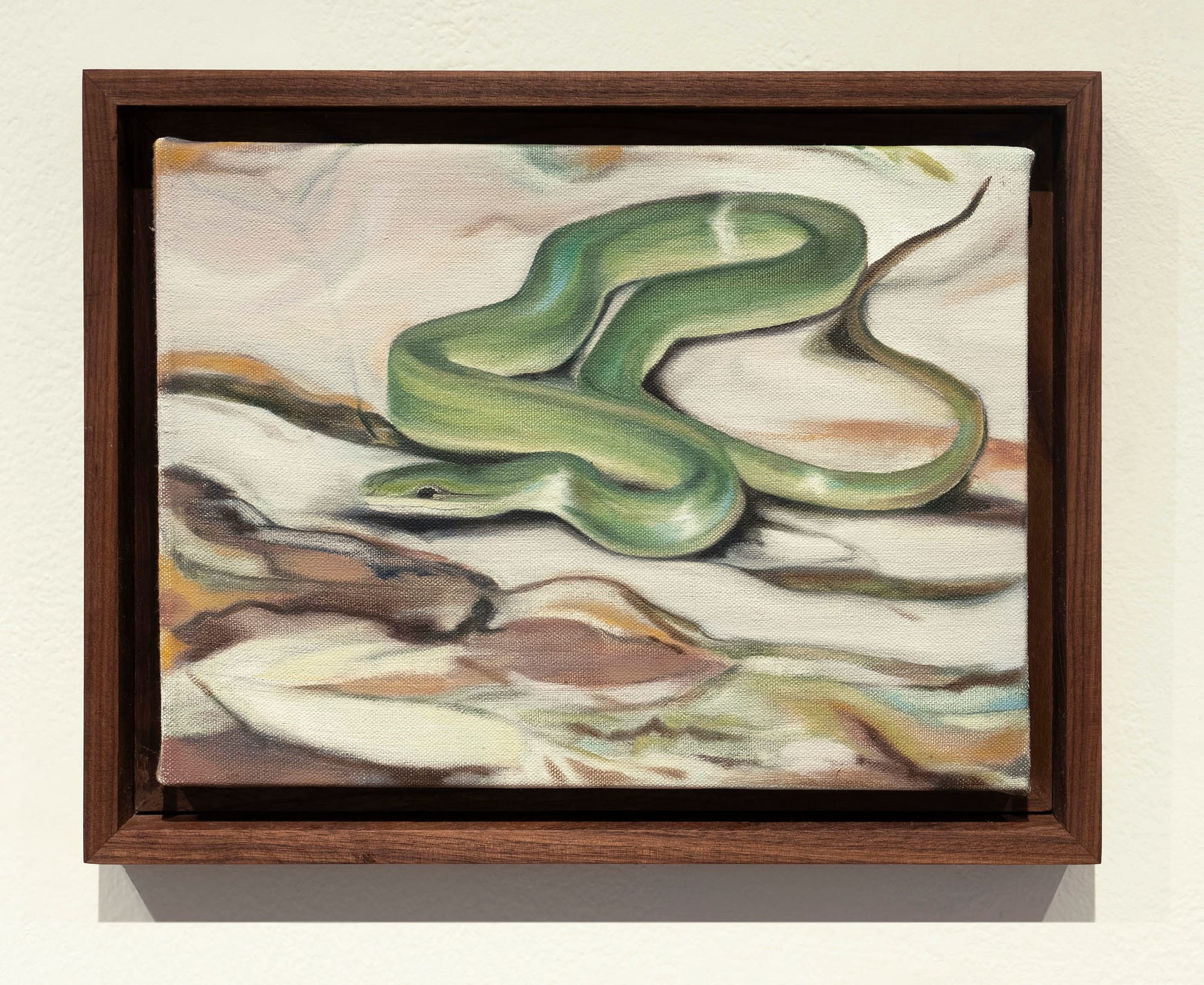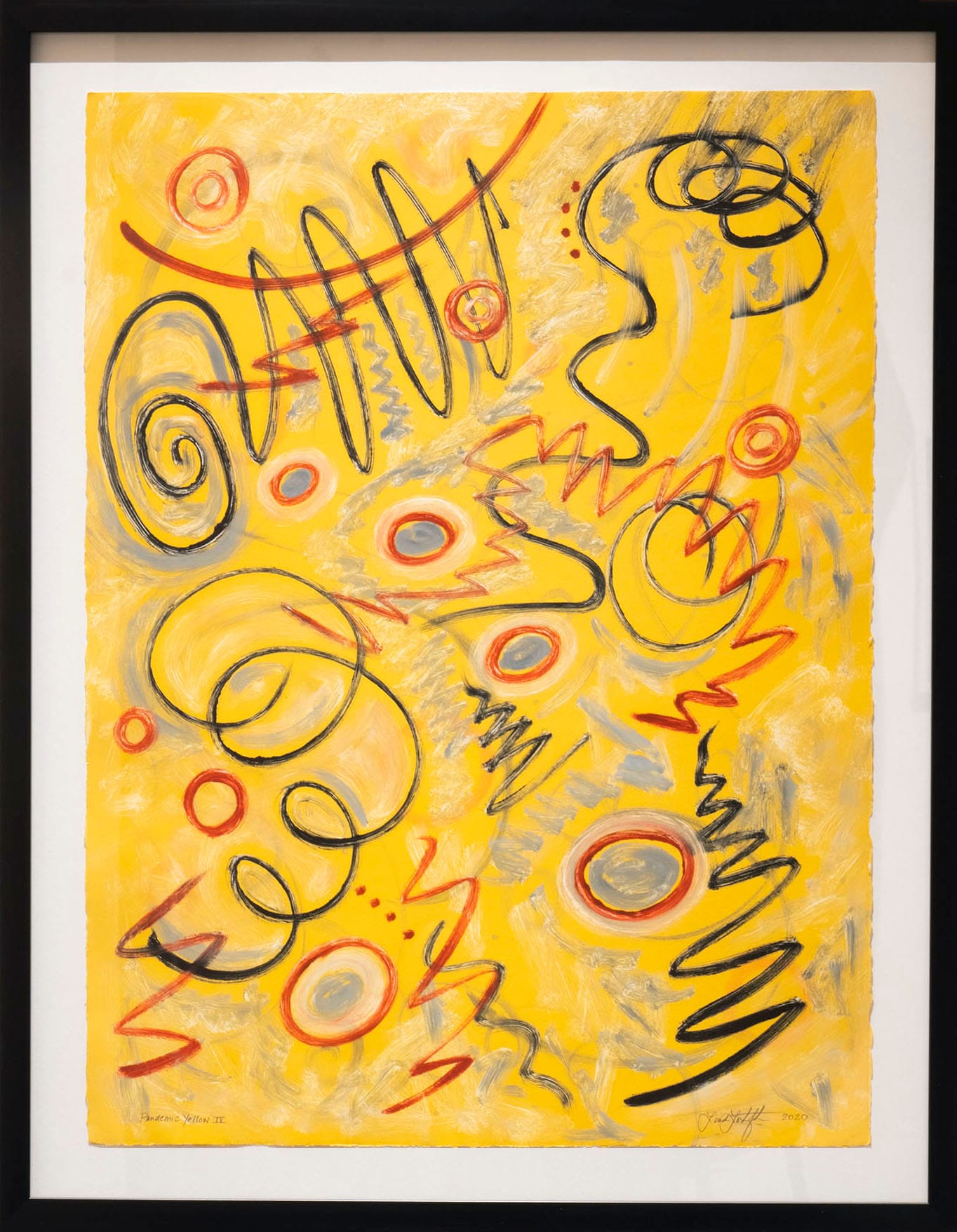 For example, Jenna Kuiper takes cues from the TPG’s penchant for symbols, prompting visceral responses to nature’s potential for poisoned and pleasured experiences. Light glints off the smooth, elegant emerald skin of a slithering snake in “Green Lady” (2021) and distorts the fuzzy halos, jagged edges, and flamelike sunbeams in “Dandelions” (2020). Lomahaftewa incorporates symbols and motifs of Hopi and Choctaw cultures, some of which is coded knowledge not available to people outside of Hopi traditions, and some of which speaks to a collective consciousness, shared or universal experiences, and elements of natural landscapes.
