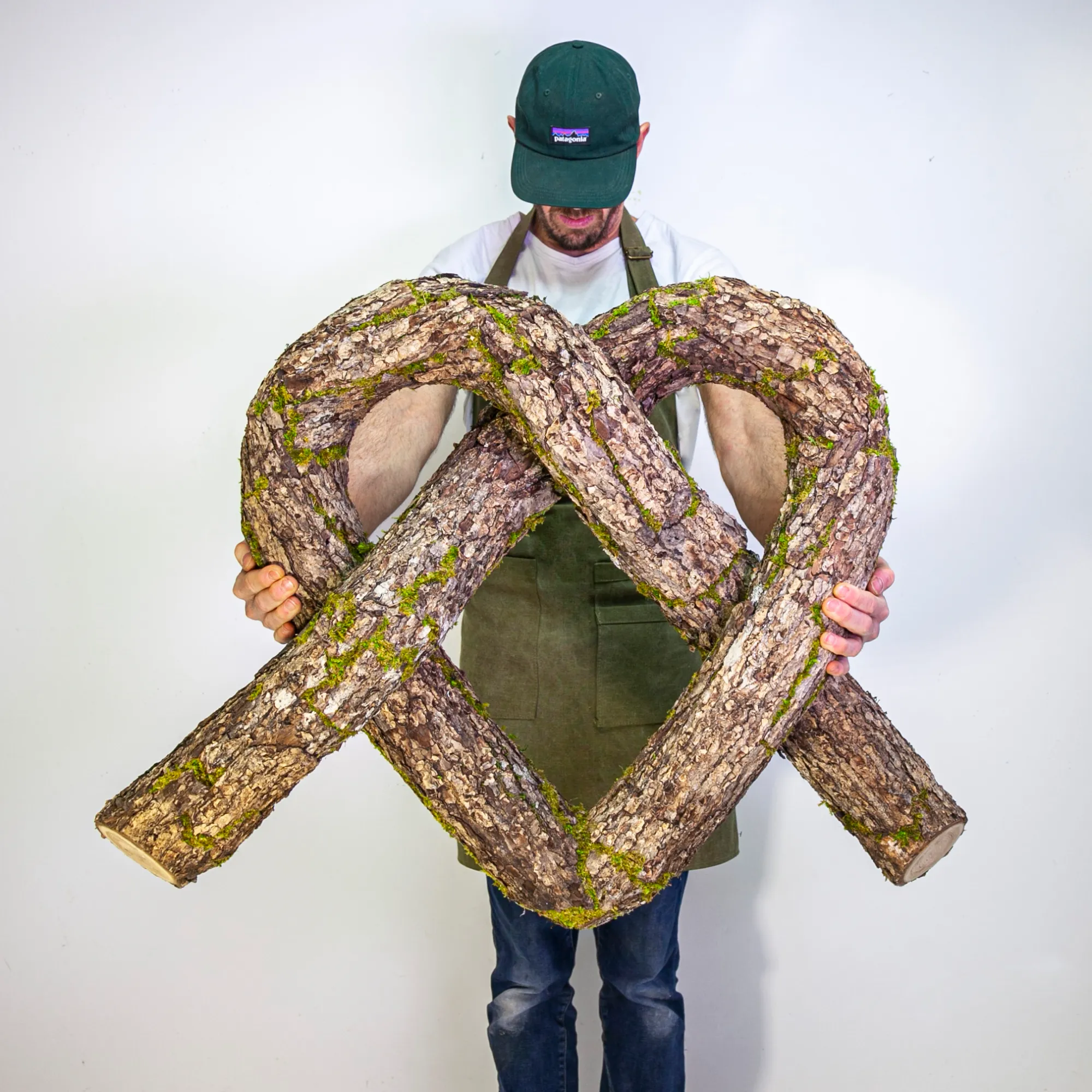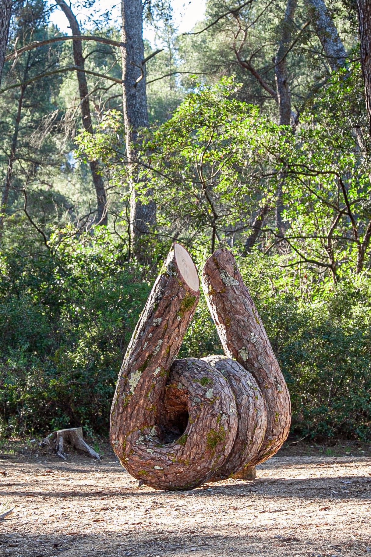 There are five large sculptures in the collection, with forms ranging from identifiable symbols like a heart and infinity loop to common configurations, like the spring coil and knot. The largest, most complex work, "Wooden Lace," presents an intricate confluence of tree forms.