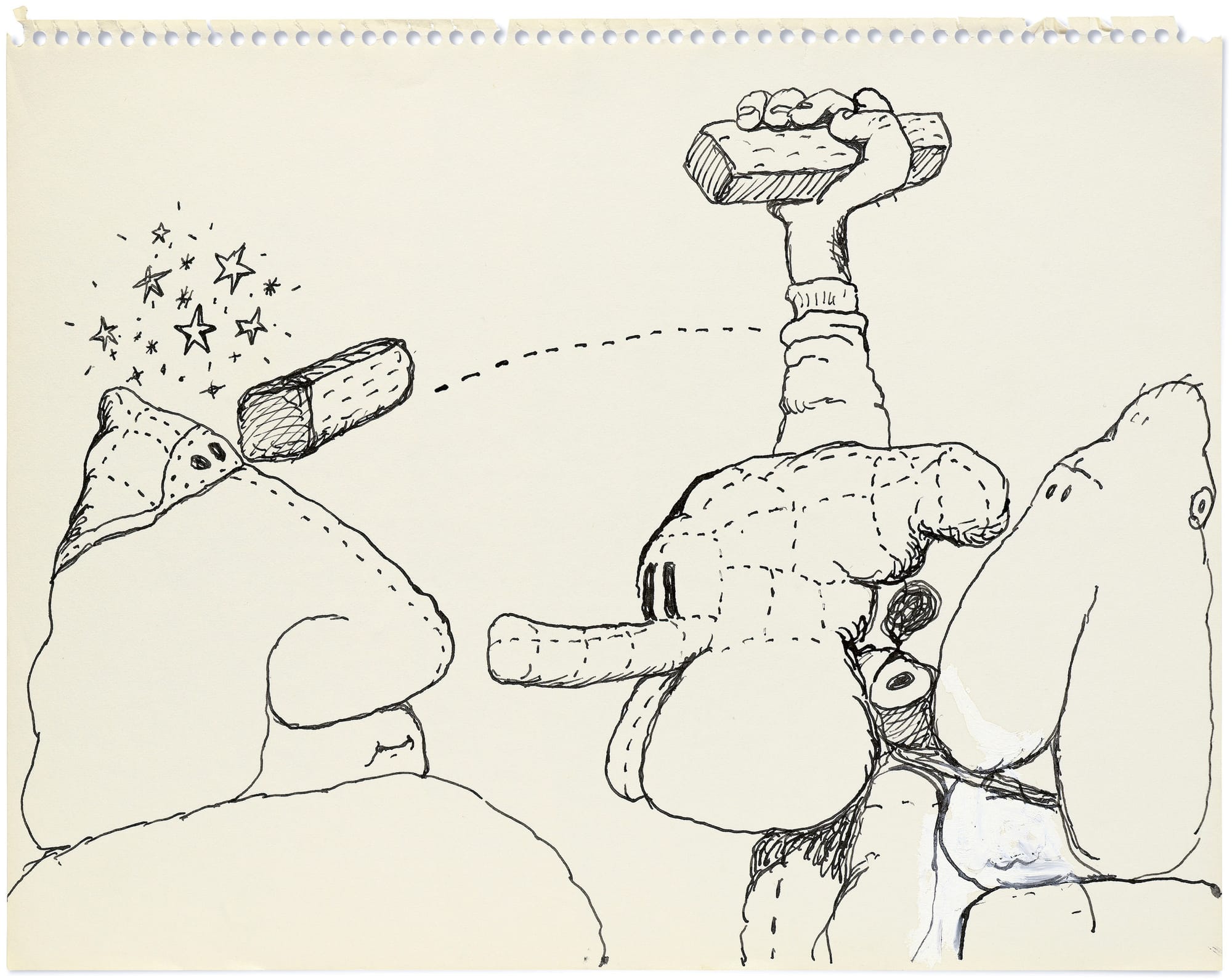 In 1997, when Trenton Doyle Hancock was in his senior year at Texas A&M University–Commerce, he wrote on a scrap of blank paper in large outlined letters, amid homophonic word associations (“eggs stinked”) and drawings: LIKE GUSTON BUT BLACKER AND WORSE. This note marked the beginning of his long engagement with Philip Guston’s cartoonish depictions of hooded figures. That connection is the focus of the superb exhibition Draw Them In, Paint Them Out: Trenton Doyle Hancock Confronts Philip Guston at the Jewish Museum, curated by Rebecca Shaykin.
