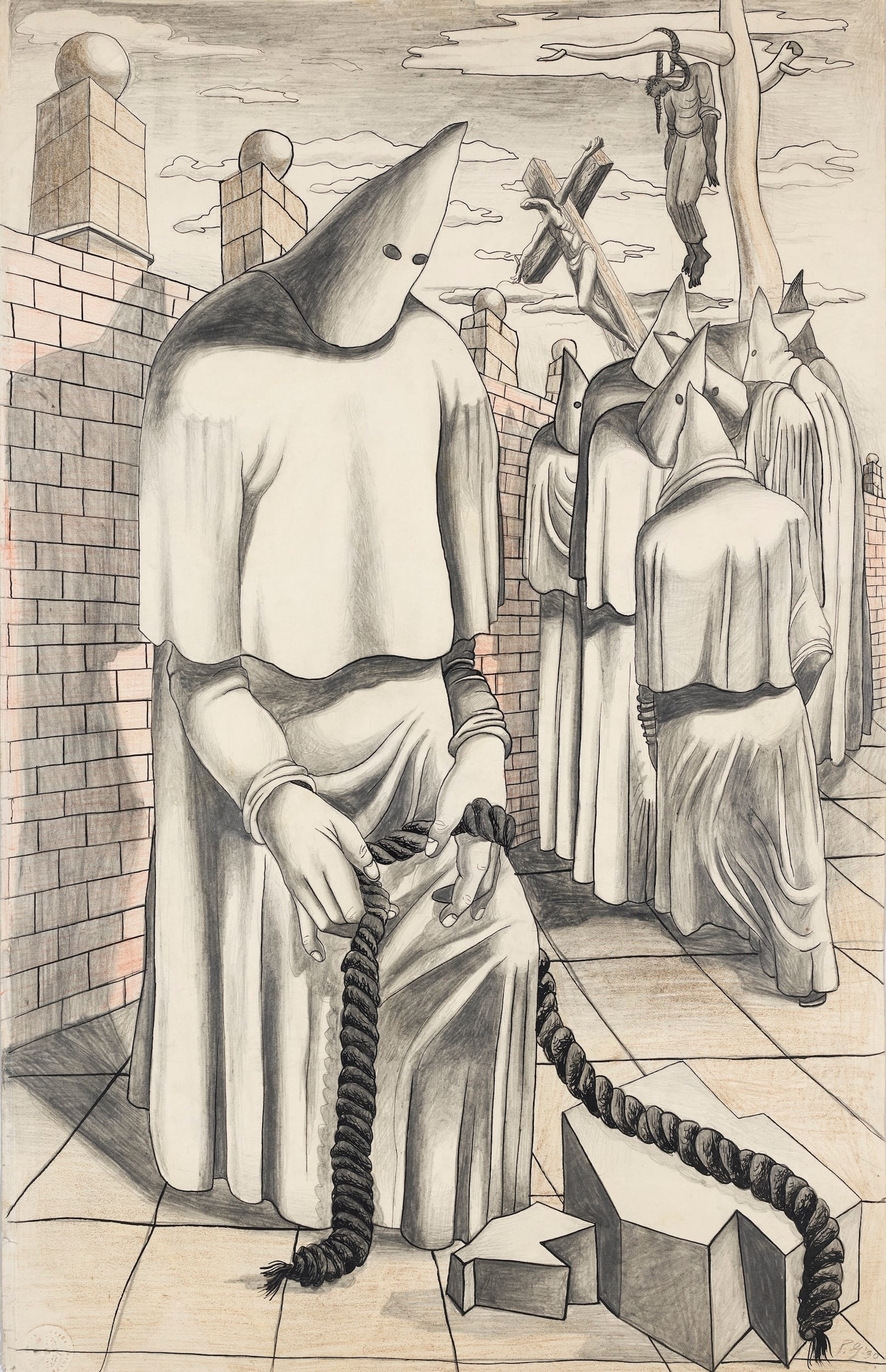 The exhibition sets the stage for this central encounter by providing documentation of a mural Guston painted for the John Reed Club in Los Angeles in 1931 that was later destroyed, as well as a fresco that he worked on in Morelia, Mexico, with Reuben Kadish, and Jules Langsner (“The Struggles Against Terrorism,” 1935), and “Drawing for Conspirators” (1930), one of the few surviving works from Guston’s early explorations of racism and state-sanctioned terror.