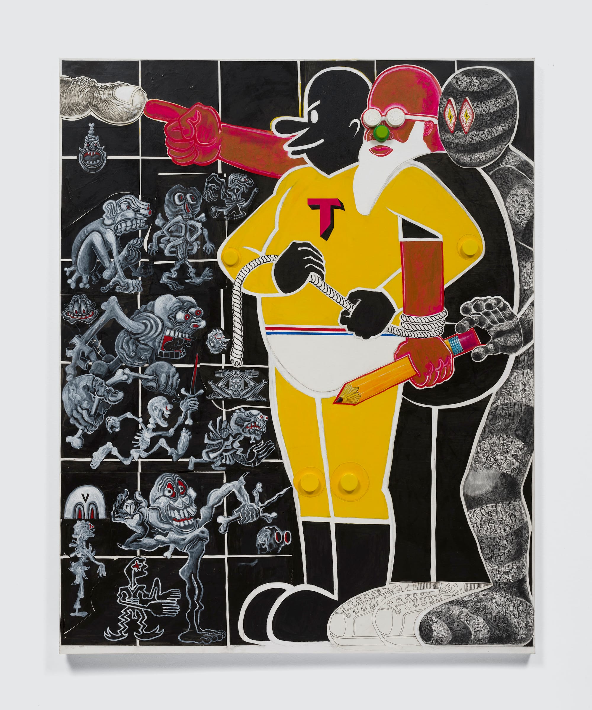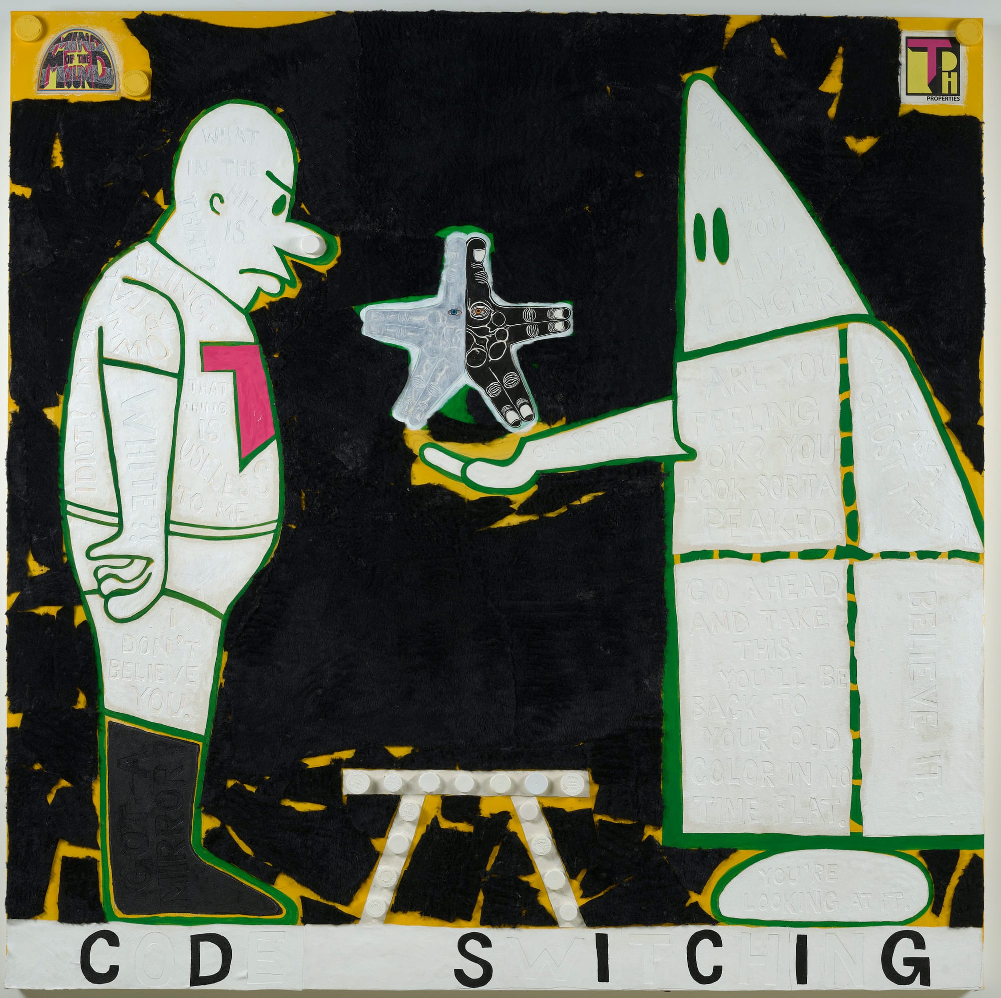 A star of the show is one of Hancock’s graphic alter-egos, Torpedo Boy, a pot-bellied, balding Black superhero who wears white briefs and black boots over a bright yellow bodysuit. Through his schlubby character, who possesses more brains than brawn, Hancock takes on his version of Guston’s doltish Ku Klux Klan figure.