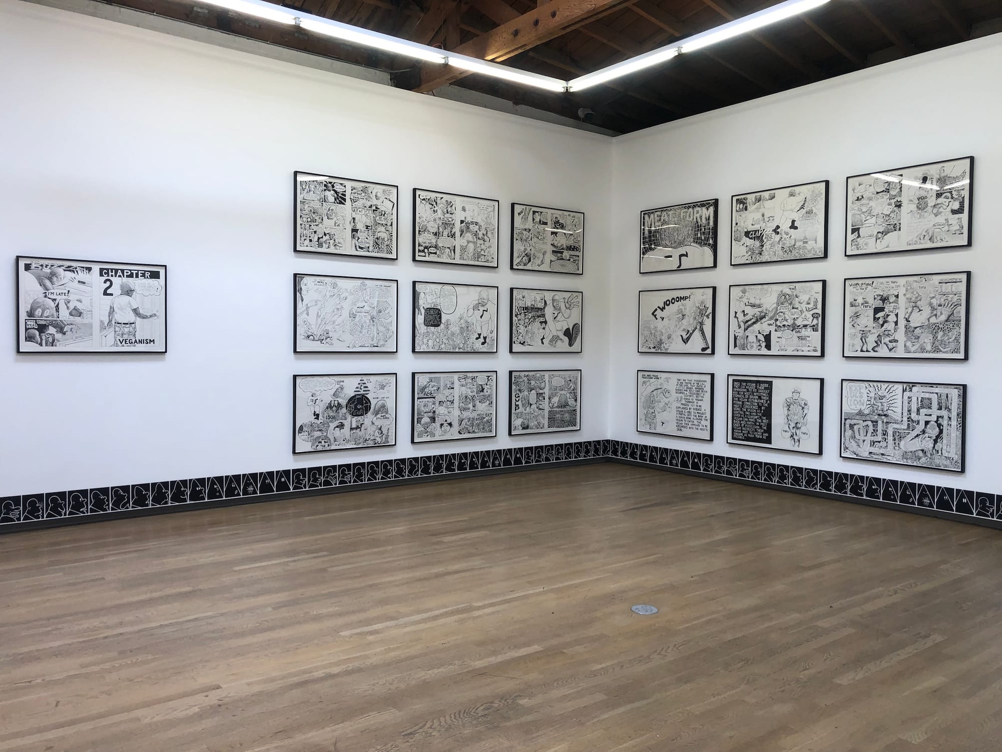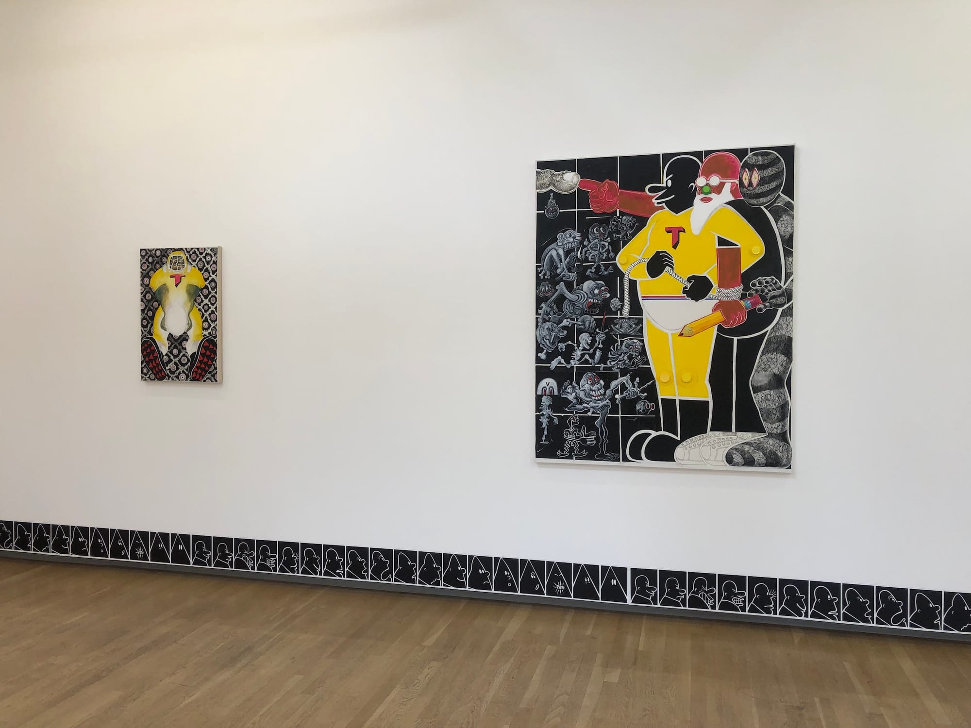 Hancock is nothing if not a world builder. One of the exhibition’s highlights, displayed as a series of 19 framed drawings, is Trenton Doyle Hancock Presents The Moundverse: Chapter 2 Veganism — a preview of a graphic novel that will eventually become a four-volume book. In Hancock’s universe “veganism” is a stand-in for extremism, yet the stories reflect a sense of moral ambiguity; in any given scenario it can be hard to tell the good guys from the bad guys. This ambiguity extends into a comic strip running along the floor of the gallery in which Hancock himself repeatedly transforms into the Klansman — another character in his universe that embodies racism and hate, based loosely on Philip Guston’s similar figures, but raising more self-reflexive questions of complicity in Hancock’s work.