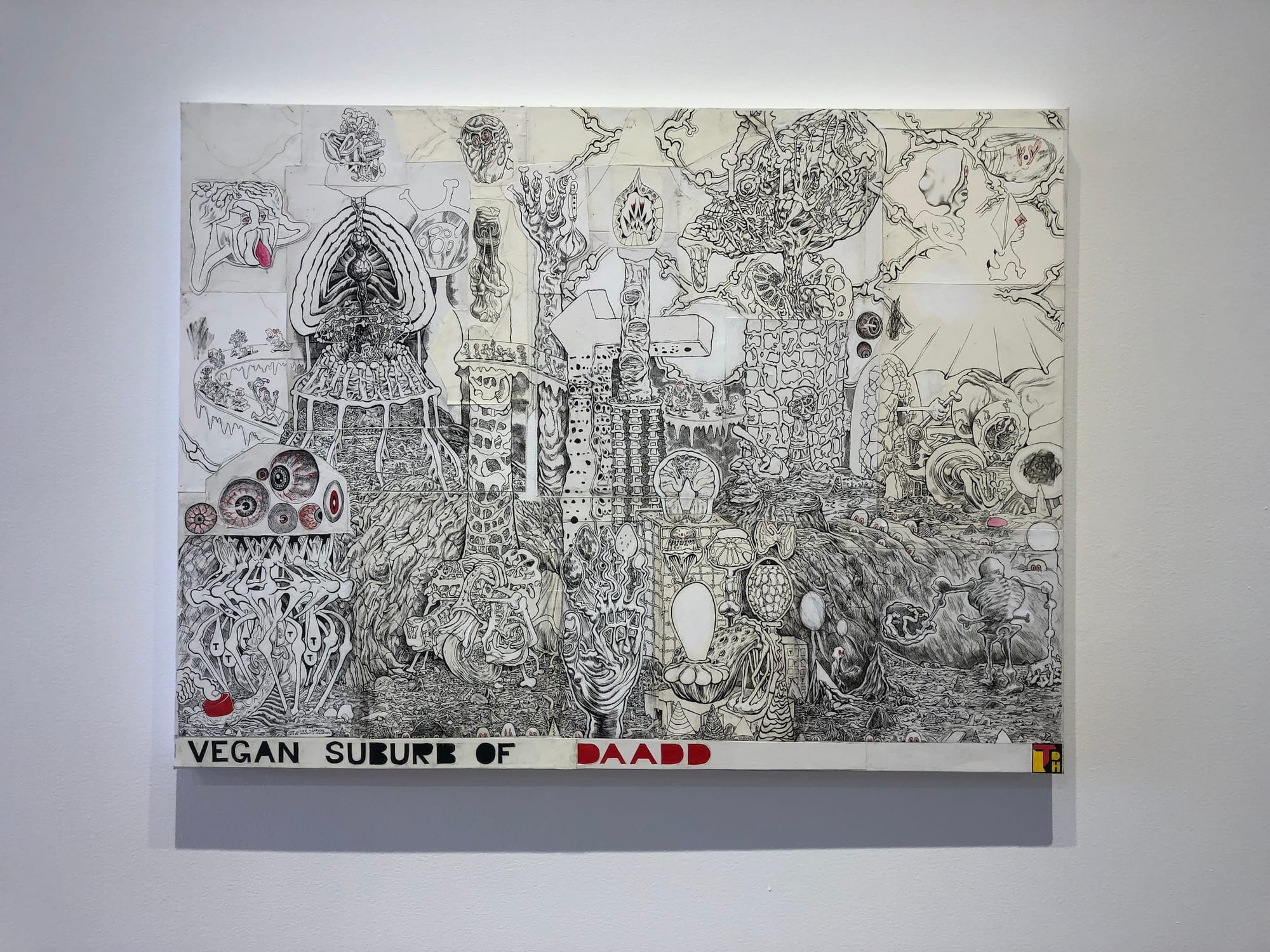 Formally, the black and white drawings of the vegan universe — especially “Vegan Suburb of Wrong,” “Vegan Suburb of Bonehead,” and “Vegan Suburb of Daadd” (all 2022) — are some of the exhibition’s most successful works. They display a sophisticated combination of mark-making, pattern, text, and composition that stuns pictorially. In “Vegan Suburb of Daadd,” Hancock uses classic drawing techniques such as cross-hatching and line variation to keep the viewer’s eye engaged in an intricately connected vegan living complex that comes complete with a series of city towers seemingly constructed of bones. Yet for viewers who are not well acquainted with Hancock’s work, the storyline remains somewhat convoluted. The overarching theme seems to be a fairly straightforward one along the lines of “every cop is a criminal,” but the use of tofu-eating zombie vegans to illustrate fanaticism and even perhaps moral decay delves fairly problematically into the realm of stereotype, and I am left wondering why this was chosen as a representation of extremism.