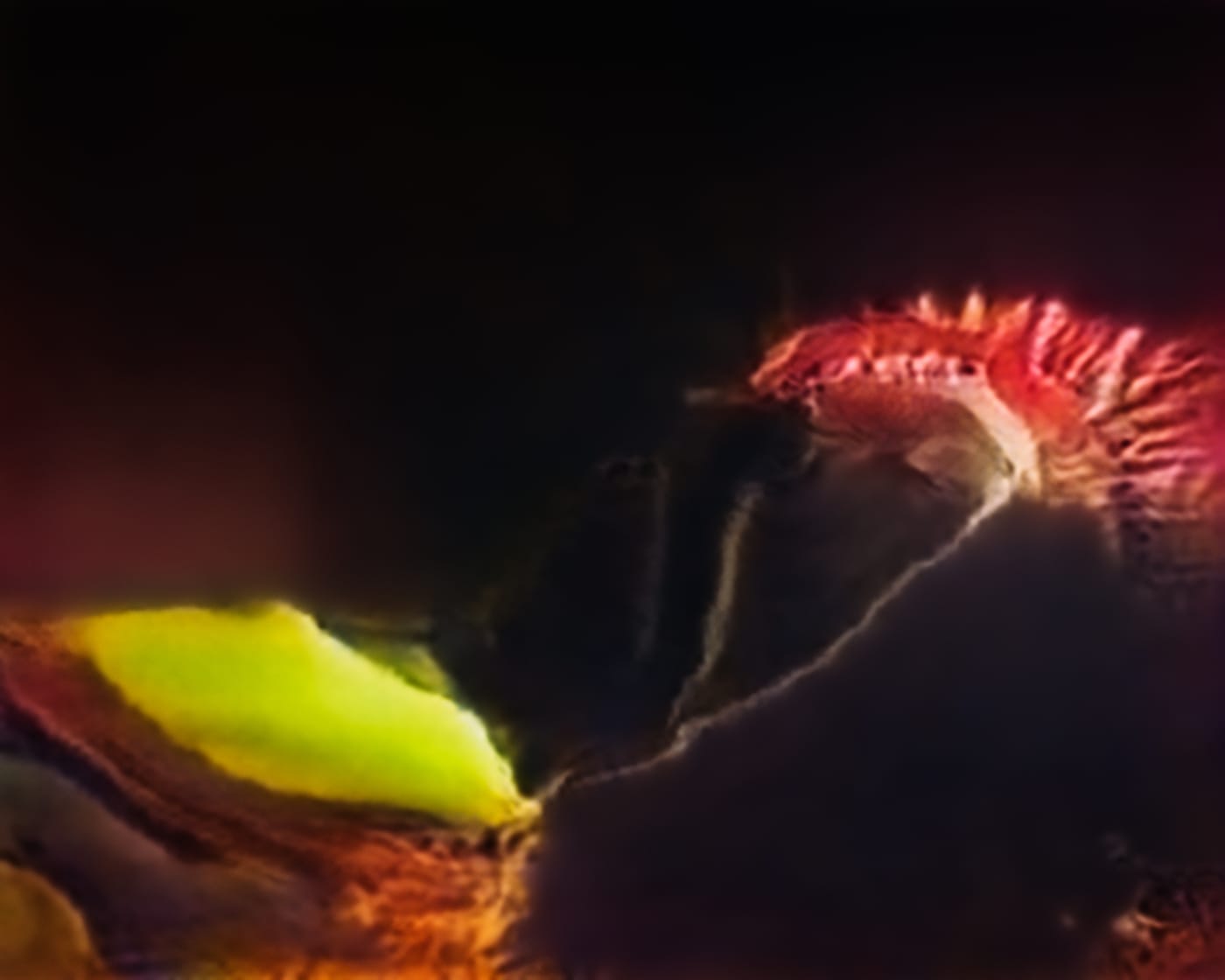 The exhibition consists of various examples of “invisible images.” These include visualizations of the data sets which train machines to identify subjects and objects in an image. One of those visualizations features what Paglen refers to as a “face-print” of post-colonial theorist Frantz Fanon. The ghostly portrait, which looks as if it emerged out of the ether of collective consciousness, is actually a representation of the data that makes Fanon’s features mathematically distinct from other faces. In another series, titled Hallucinations, oddly expressive prints resemble abstract expressionist paintings. Each is an amalgamation of a massive set of images that Paglen compiled to train a computer to recognize “irrational” concepts, such as the symbolism used in the interpretation of dreams.