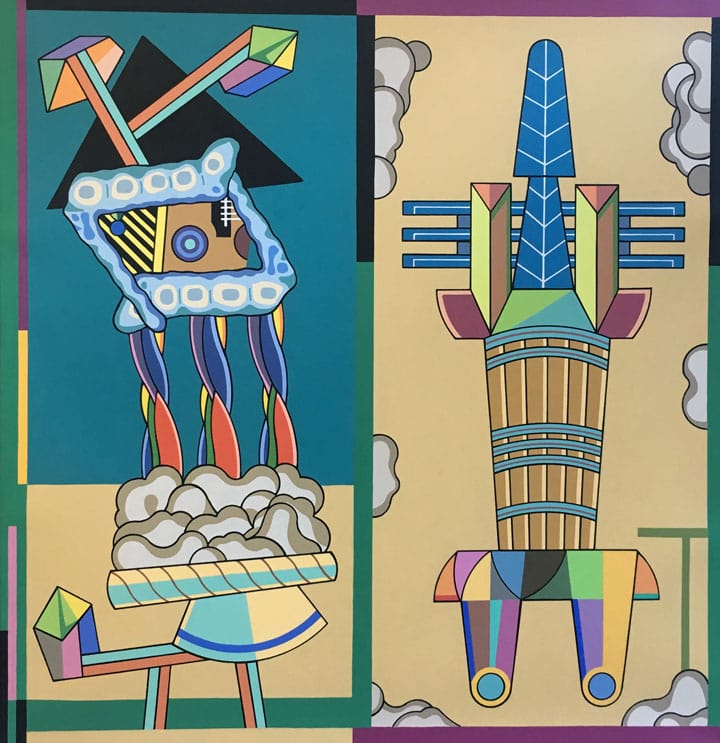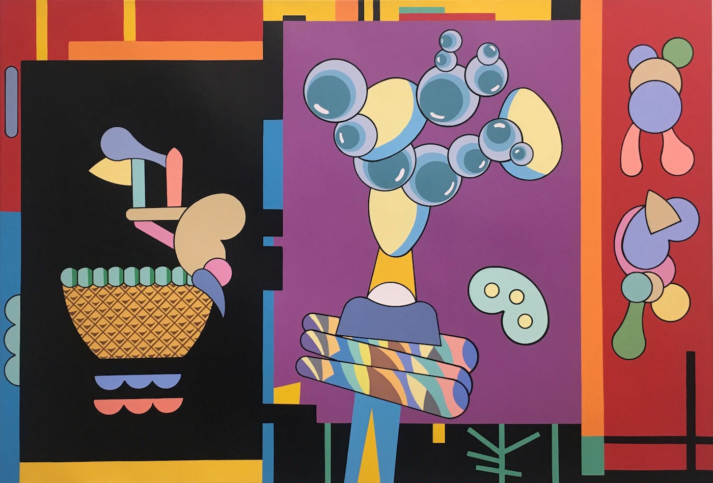 Winkfield begins with a collage, which is a hybrid of geometric forms and representational motifs rendered in solid colors. Whether the resulting image is a bird or an unidentifiable thingamajig, it is composed of outlined abstract shapes, which may be patterned or solidly colored. Over the years the artist has accumulated a vocabulary that ranges from heraldry to cartoony biomorphism, from crisp patterns to sly nods to artists he admires, such as Rene Magritte, Piet Mondrian and Kazimir Malevich. Along the way, he seems to have become an expert in vexillology, the study of flags.