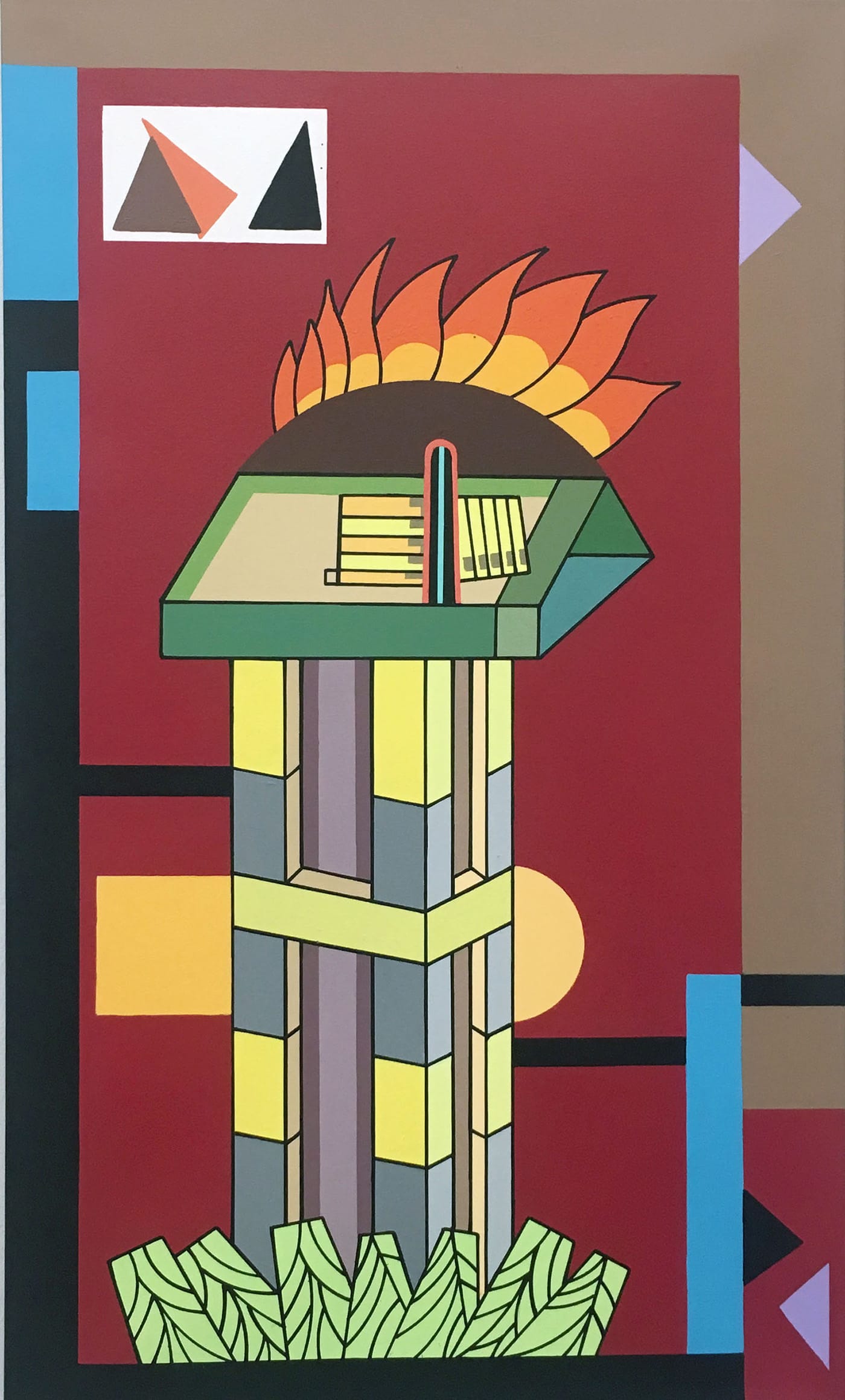 In Winkfield’s matchless paintings, the personnages may be things animated by one’s imagination. Didn’t we used to spend long hours talking to a stuffed animal or doll? Weren’t these objects friends who could keep our secrets? In “The Sundial” (2017), Winkfield depicts a sundial rising from stylized foliage. Seen in perspective, it is crowned by a brown semicircle from which stylized flames shoot upward, a visual pun on the words “sun” and “dial.” It is a sundial and a dream of a sundial. In the upper left-hand corner, Winkfield has placed three triangles within an inset white rectangle, suggesting the pyramids or a geometry lesson. So much happens in a Winkfield painting that is not instantly apparent. For all of their strong, solid colors and bold forms, these are not quick paintings. We cannot domesticate the otherness of Winkfield’s images, what I have been calling his totems and personnages.