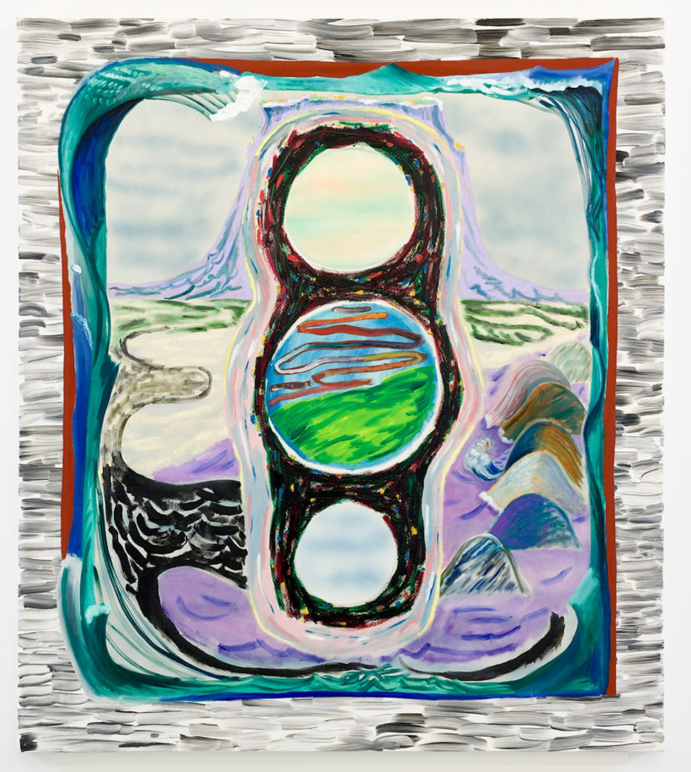 As an example of such distancing is “Eye of the Swell” (2016), which takes elements of the landscape and uses them as a doubled framing device. A border is created through thin, horizontal strokes of cool grey, which encloses an inner border made from waves painted in turquoise and ultramarine blue, which in turn houses the active space of the painting. Here, Hughes paints simplified waves, rocks, a distant mesa resembling Wyoming’s Devil’s Tower, and a bluish-white sky. All of this structural work is at the service of the central form, where three vertically-stacked hollow circles, outlined in impastoed crimson-blacks, offer abstract variants of the painting’s color, surface texture and iconography. This central form radically skews an otherwise traditional landscape, bending our orientation toward other horizons. Peering into the circles, we are soon snapped back toward the entirety of the painting. This work, along with others in the exhibit, reveal the mystifying breach between our own subjective perceptions, our memories of a lived event and reality. When Klimt went on his plein air painting expeditions, he would often use a telescope or “viewing frame,” both tools with the capacity of presenting a detail as a totality. Similarly, this central form acts as pair of binoculars, ones that peer beyond the world of given appearances.