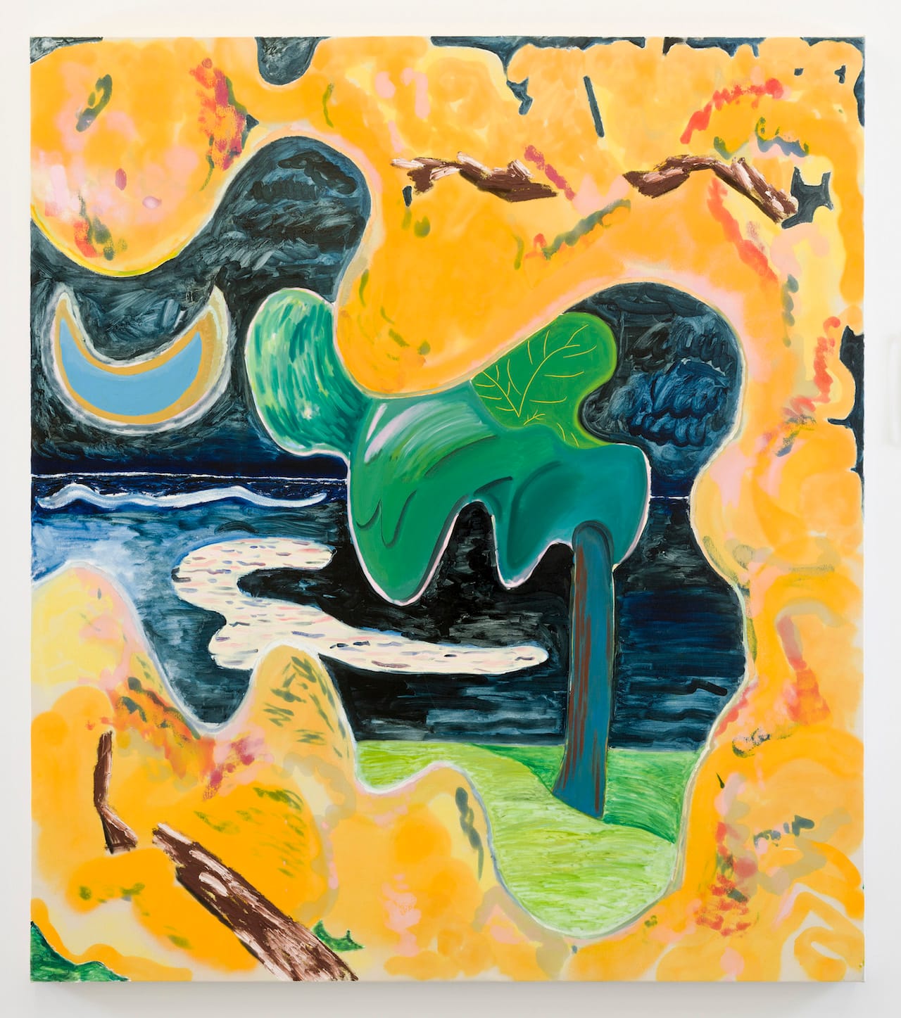 In contrast, “I Spy” (2016) veers toward the otherworldly. Here, a curved, thinly painted, warm yellow form that follows the perimeter of the canvas along three of its four sides, reading as low hanging leaves at the top and a hillock at the bottom. Thickly impastoed, dirt-brown swatches of paint dart across the yellow lead the eye to the central clearing — a glade where a sagging turquoise-blue tree stands, its leaves drifting upward like a mushroom cloud against a blue-black sea and a large, baby blue crescent moon. This almost child-like, primordial view of nature lies somewhere personal memory and an imagined Paradise.