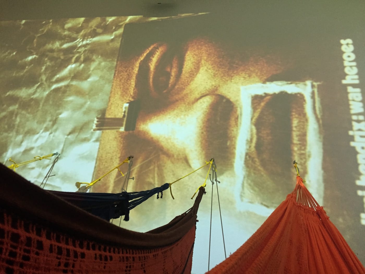 In New York, writing, video, and photography were Oiticica’s new chosen mediums — along with cocaine. He conceived of his Cosmococas, shown in his lifetime only to close friends at his apartment, where participants consumed the illicit substance and lay on hammocks, while images flashed on the walls. “CC5 Hendrix-War,” the “Cosmococa” on view at the Carnegie, projects an image of one of Oiticica’s parangolés next to Jimi Hendrix’s album cover for War Heroes, which plays and envelops the room. Oiticica considered Hendrix one of his heroes, writing that the musician embodied a kind of “MUSIC-plastic totality synthesis” in his performances. Maybe it’s because I wasn’t on cocaine, but this installation felt the most stubbornly site-specific to me — it’s possible to re-create its visual elements, but it seems difficult to translate the deliriously intimate experience to a museum space.