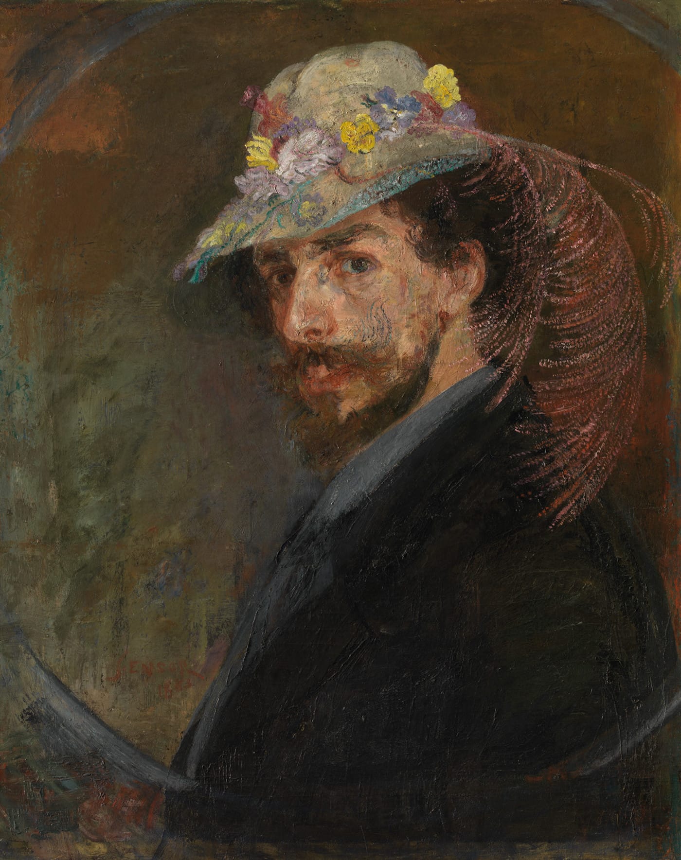 Room one focuses on early works, in which a gloomy palette depicts dim Ostend interiors and introduces Ensor’s main concerns with bourgeoisie life: “Bourgeoisie Salon” and “Chinoiserie, Fans and Fabrics,” both from 1880, are beautifully observed reflections of the niceties of middle-class life, the latter detailing the trinkets and curios sold by Ensor’s parents in their seaside Ostend shop. Even here, a savagery of technique simmers away: chunky color laid on with a palette knife, or the sharp end of the brush scraping into the wet paint. Against this, the familiar figure of the skeleton emerges, in pieces like “Skeleton Looking at Chinoiseries” (1888), as does Ensor’s more openly absurd, freefall ideas: “Self Portrait in a Flowered Hat” (1883) is a clearly finished portrait, later returned to when Ensor decided to ridicule himself — or the societal function of the portrait itself – by adding a hilariously silly floral hat, even going so far as to extend his moustache into a blue curling twill. Full marks, Tuymans, for carefully showing the progression.