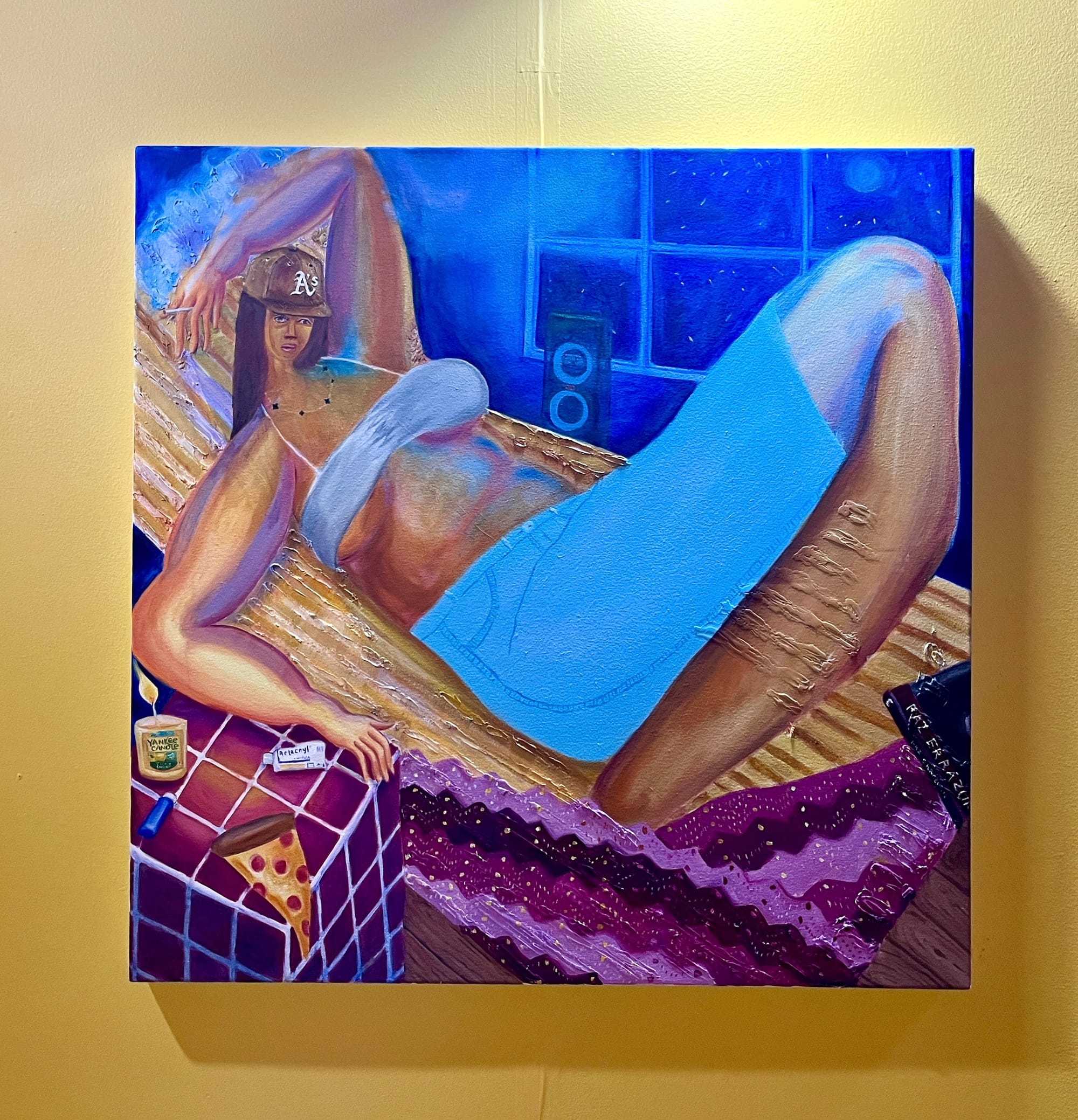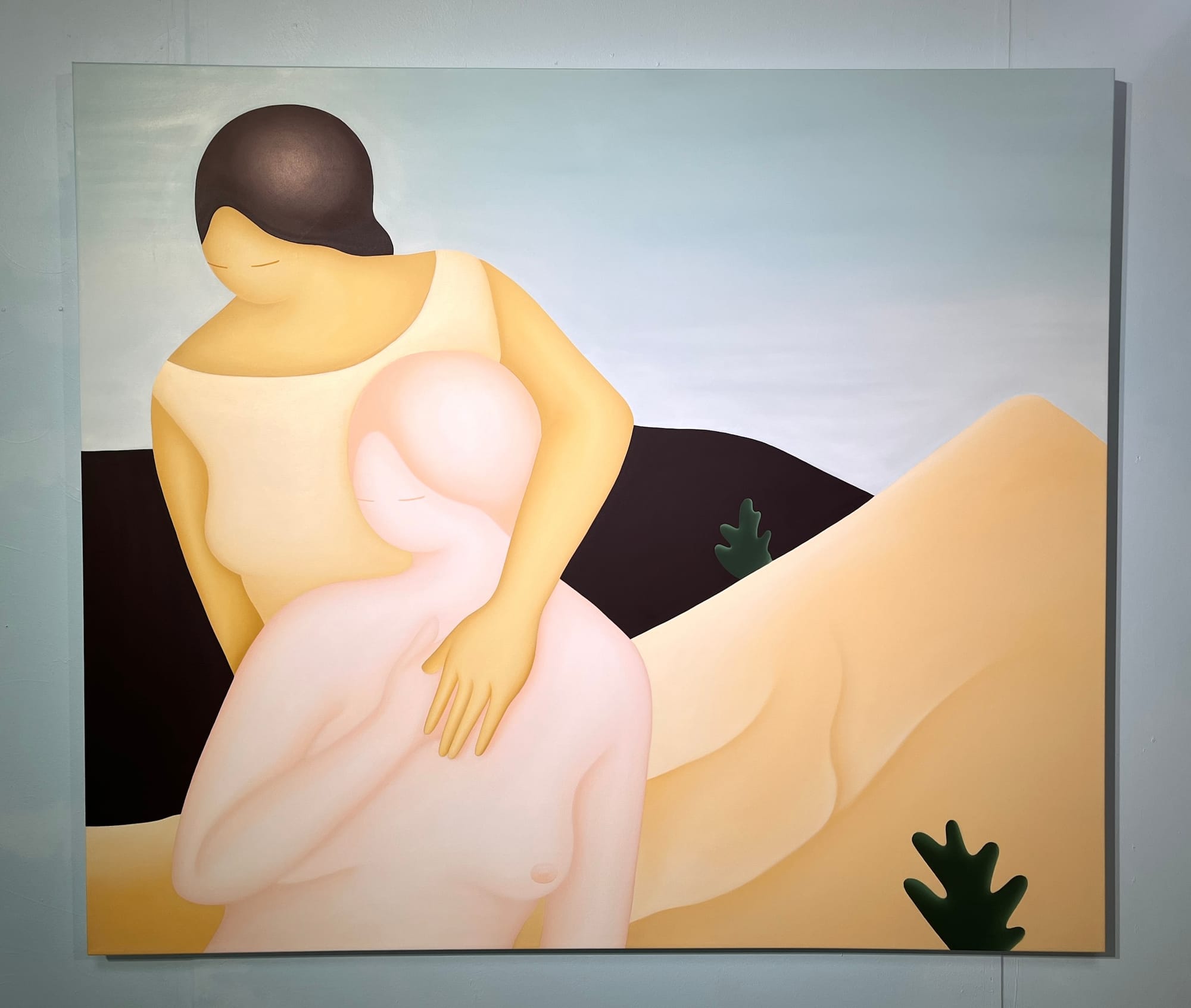 Past Nina K. Ekman's fibrous palm trees and Nora Ann-Francis Martin-Hall's giant hanging boat buoy rosary, I found Eric Diehl's works at Jackson Hunt's booth. Diehl paints mystical scenes of big desert scenes, but I favored the ones that featured wood-paneled rooms with views of lonesome places dotted across a particularly desolate and cursed section of highway between the Nevada/Arizona border. In Diehl's world, the psychological landscape of a drifter matches the interiors of rural suburban houses, the rugged Mojave desert framed by the hard angle of a jackrabbit roof and the soft curves of an electric Prius. Restrained paintings by Anaja Hvastija Gaia, curated by Sophia Ballesteros, use the thinnest application of oil paint I've seen in a minute to produce an effervescent effect on otherwise simple compositions of pale, round bodies coalescing with expanses of desert. (Also giving car culture: Rachelle Anayansi Mozman Solano's photographs of collaged Toyota trucks and Richard Zimmerman's shattered windshield cyanotypes.)