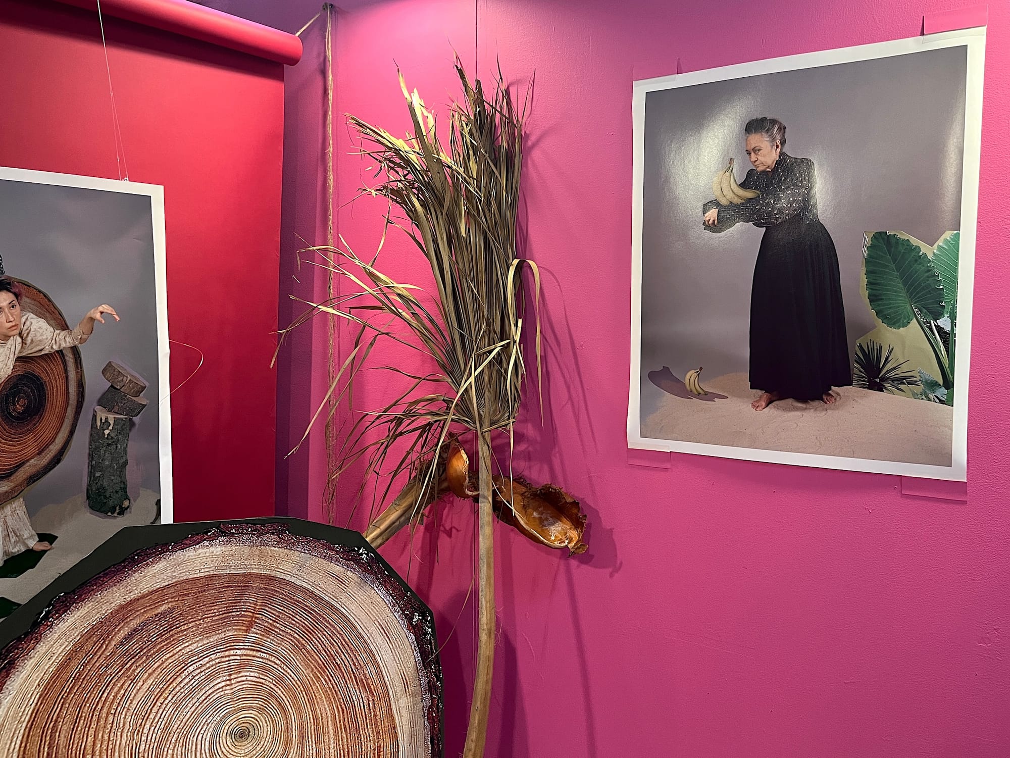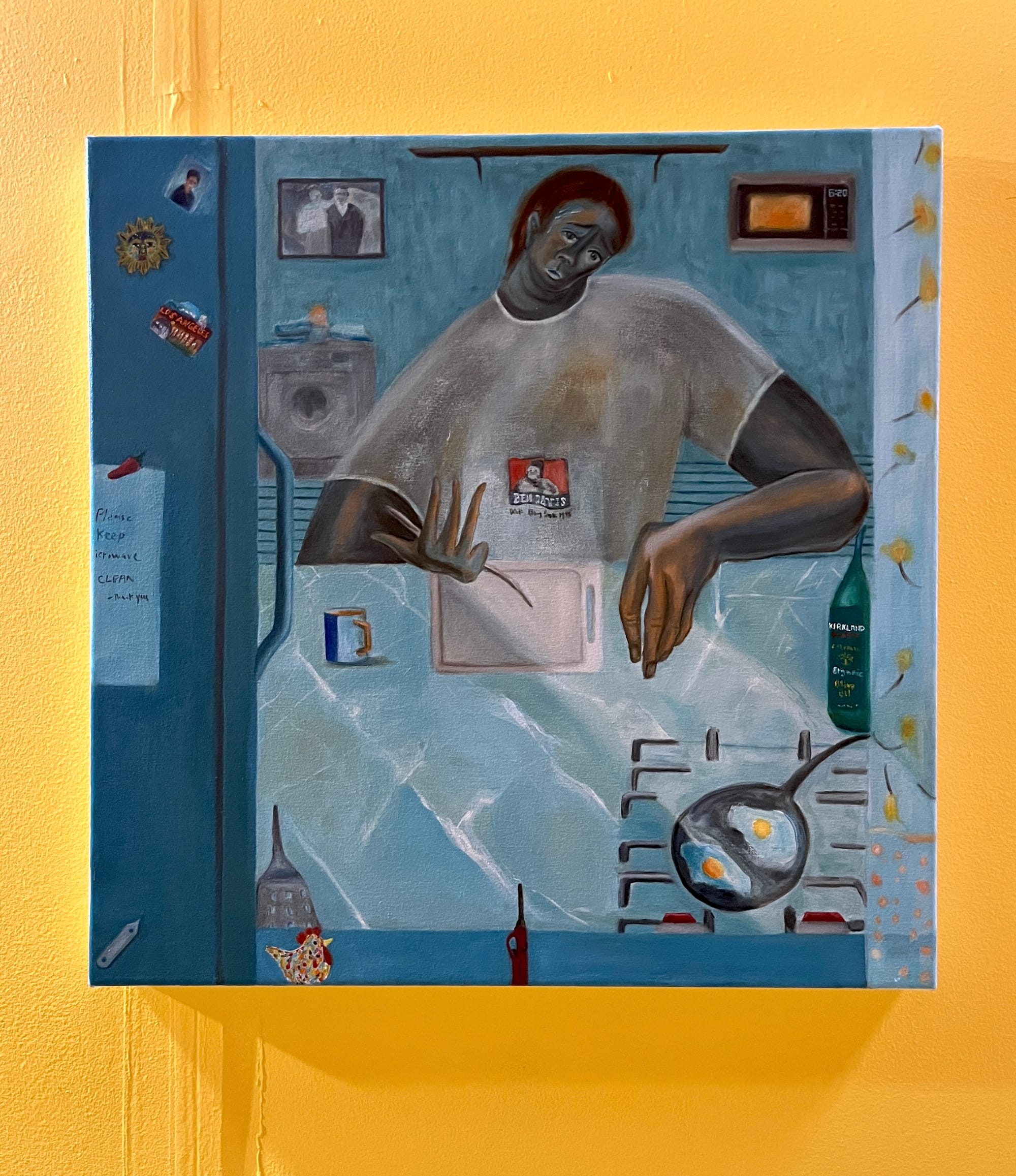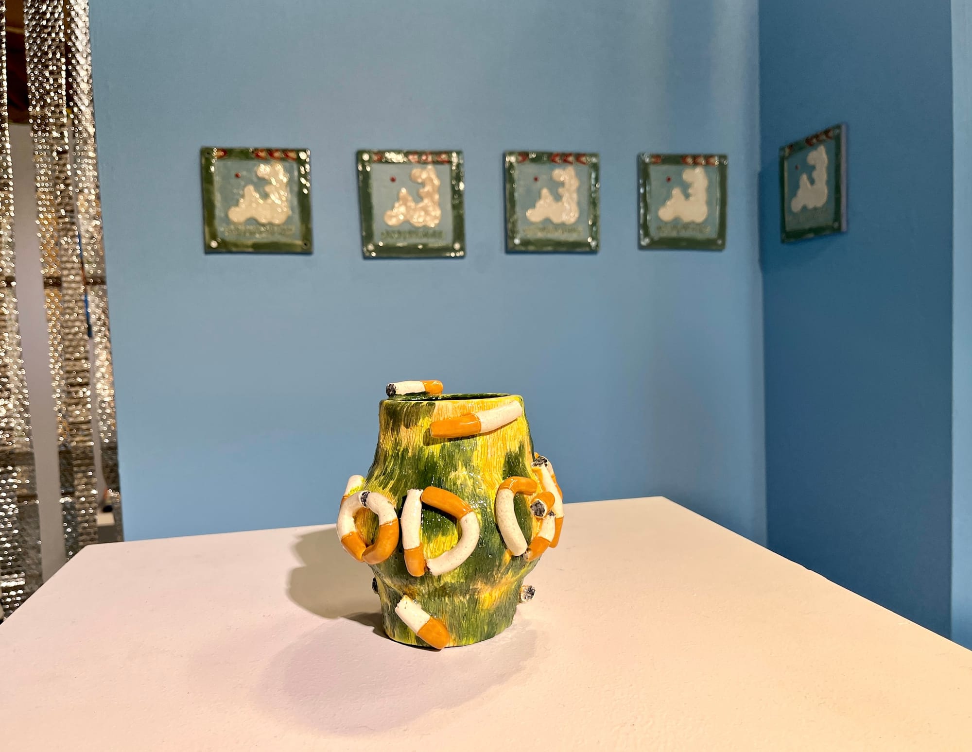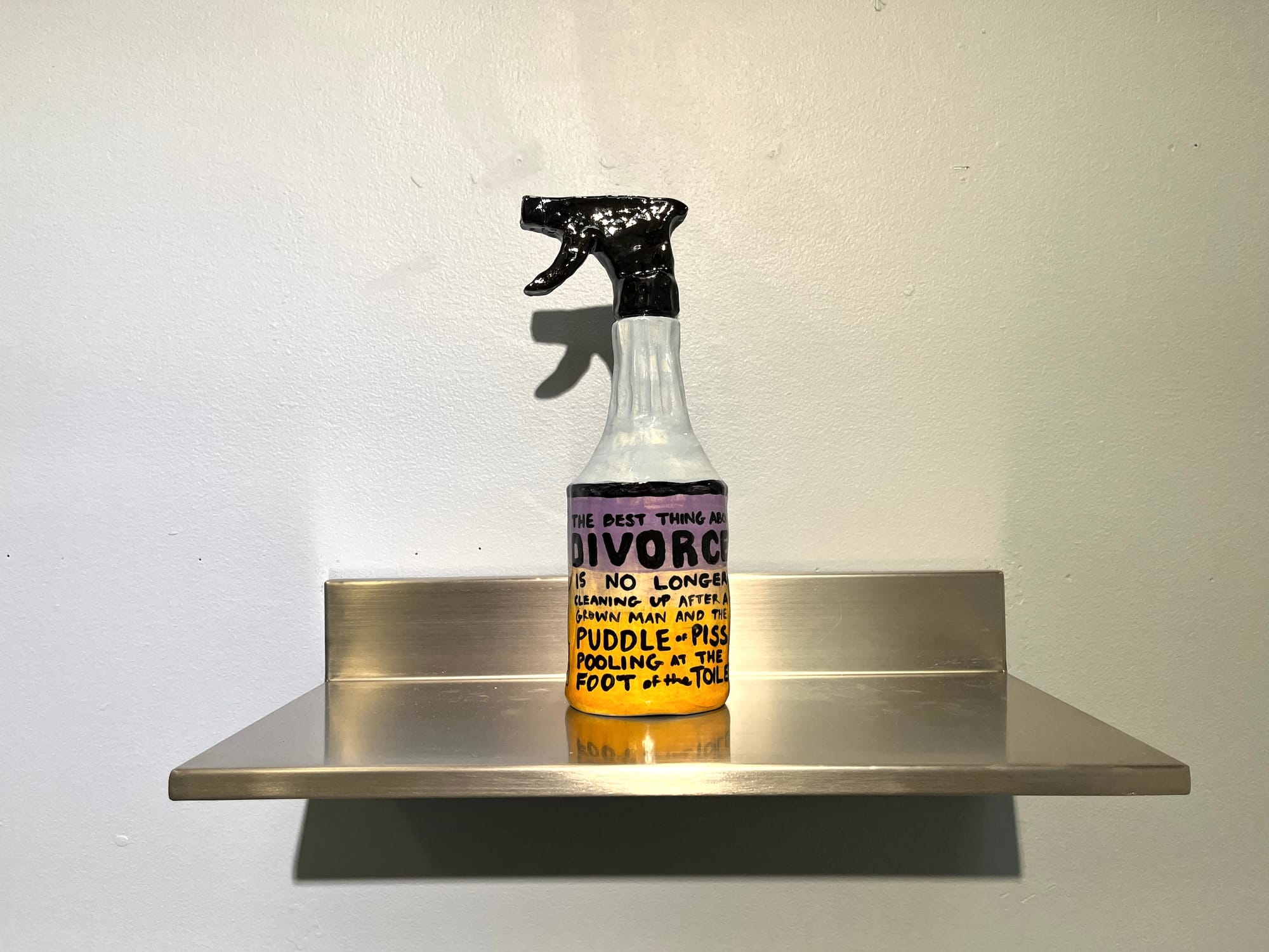 Speaking of cigarettes, artist and curator Thomas Martinez Pilnik, tufted a few in his double-boothed project FLUSH, produced with fellow artists Janet Loren Hill, Marianna Peragallo, and Taylor Lee Nicholson. The soft yarn of Pilnik's giant cigarettes propped up against the wall with Peragallo's "Amor Perfeito (Pansy)" (2022) contrasts with Nicholson's ceramic spray cleaning bottle labeled "The best thing about DIVORCE is no longer cleaning up after a grown man and the puddle of piss pooling at the foot of the toiler." (Never again!!! Congrats to Nicholson!!!)