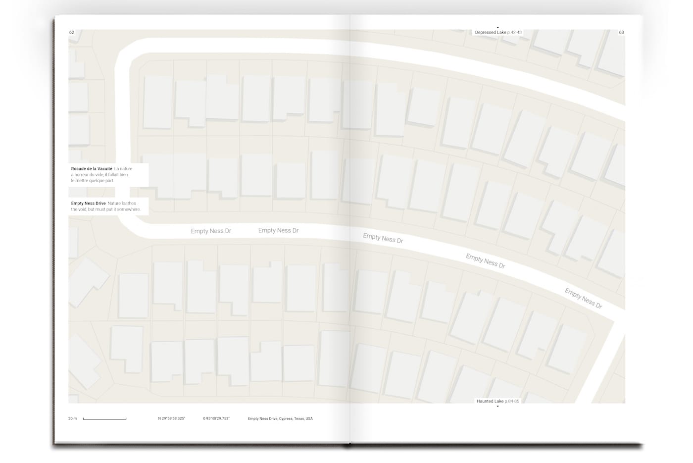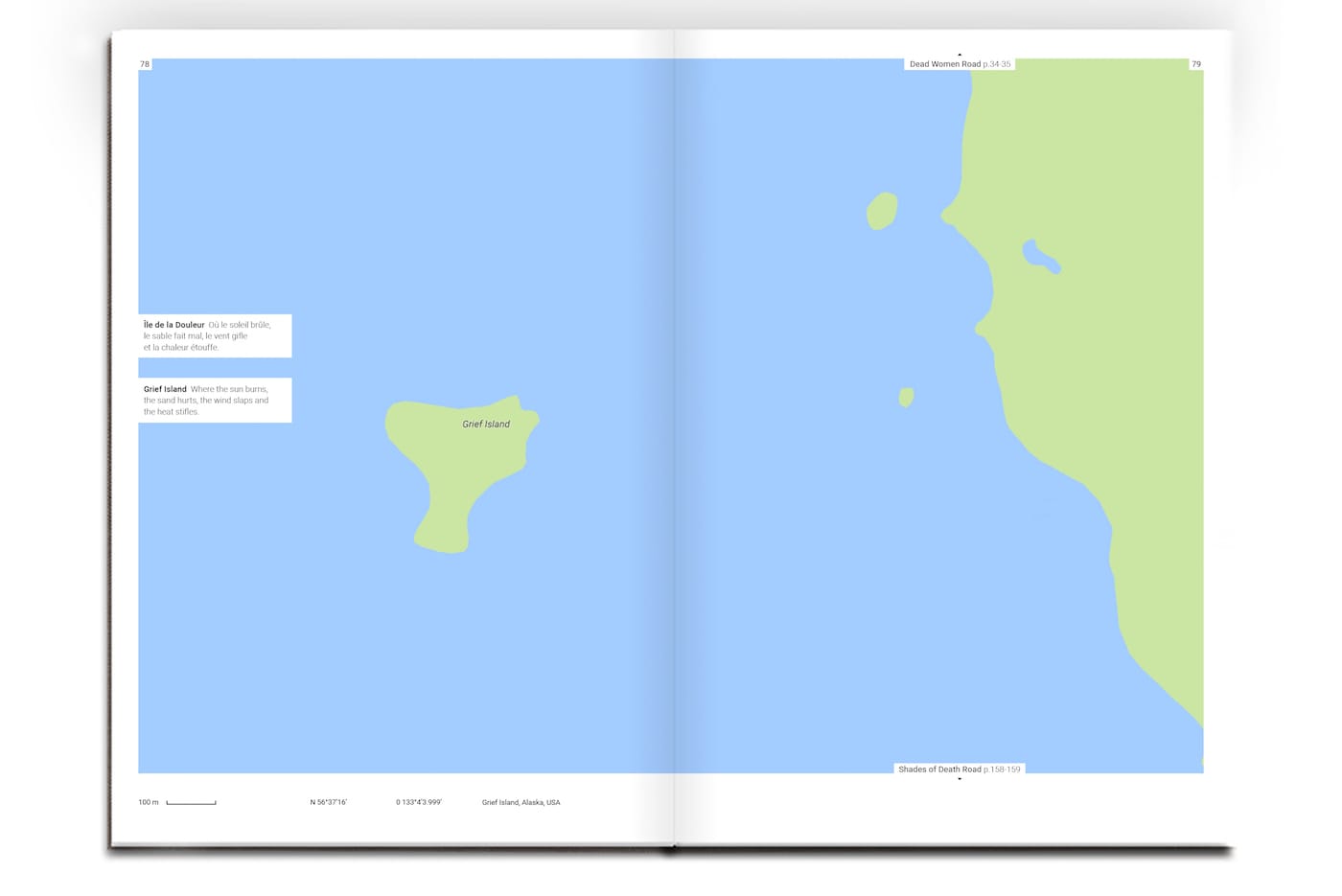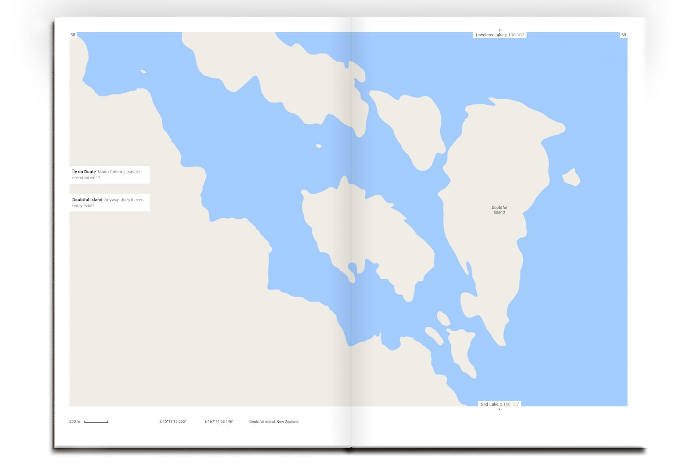 Triste Tropique, which borrows its name from Claude Lévi-Strauss’s melancholic memoir and travelogue, differs from its social media version in a few ways. It’s more organized, laid out chronologically — from Abandoned road in Hartwick, New York, to Worthless Road in Laytonville, California — even comes with a “sad index” of each location. It also features brief texts to accompany each location by writer Cécile Coulon. Some of these vividly imagine what these places are like (Despair Island: “Black sand beach, drooping coconut palms and silent crabs, even the wind avoids passing here.”); but others read like uninspired koans from a fortune cookie (All Alone: “Obviously, whoever follows this path won’t encounter anyone, but could very well find themselves.”).