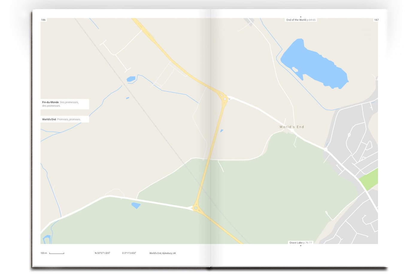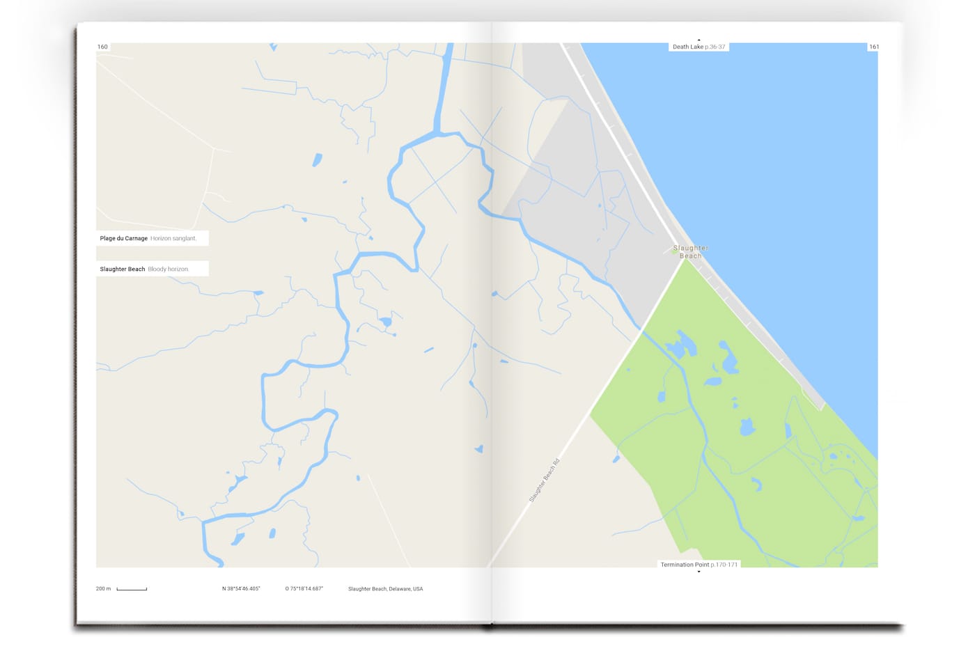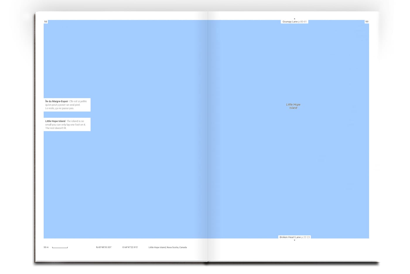 Triste Tropique, which borrows its name from Claude Lévi-Strauss’s melancholic memoir and travelogue, differs from its social media version in a few ways. It’s more organized, laid out chronologically — from Abandoned road in Hartwick, New York, to Worthless Road in Laytonville, California — even comes with a “sad index” of each location. It also features brief texts to accompany each location by writer Cécile Coulon. Some of these vividly imagine what these places are like (Despair Island: “Black sand beach, drooping coconut palms and silent crabs, even the wind avoids passing here.”); but others read like uninspired koans from a fortune cookie (All Alone: “Obviously, whoever follows this path won’t encounter anyone, but could very well find themselves.”).