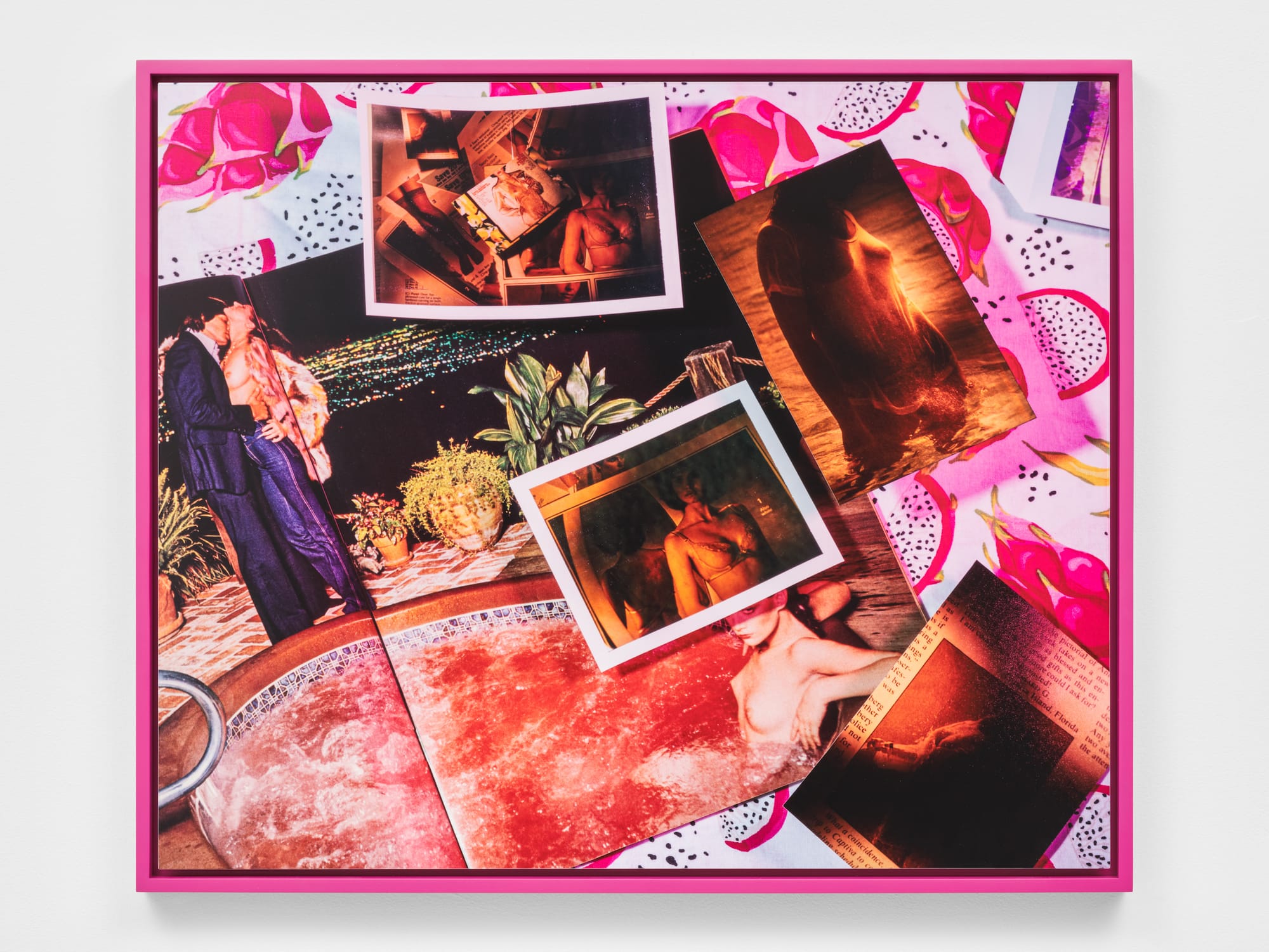 In the pink-framed “Hours Filled with Distance,” photographs and a magazine spread are scattered atop a pattern of dragonfruit, which signifies the power of transformation. The magazine spread shows a man kissing the neck of a bare-breasted woman. Next to them is a sunken whirlpool filled with red water, in which a nude woman rests. The photographs, depicting women who are nude or in lingerie, are largely different shades of red and orange, in contrast to the man's blue suit and the background of the magazine image — a night view of a distant urban landscape, suggesting Los Angeles seen from the Hollywood Hills.