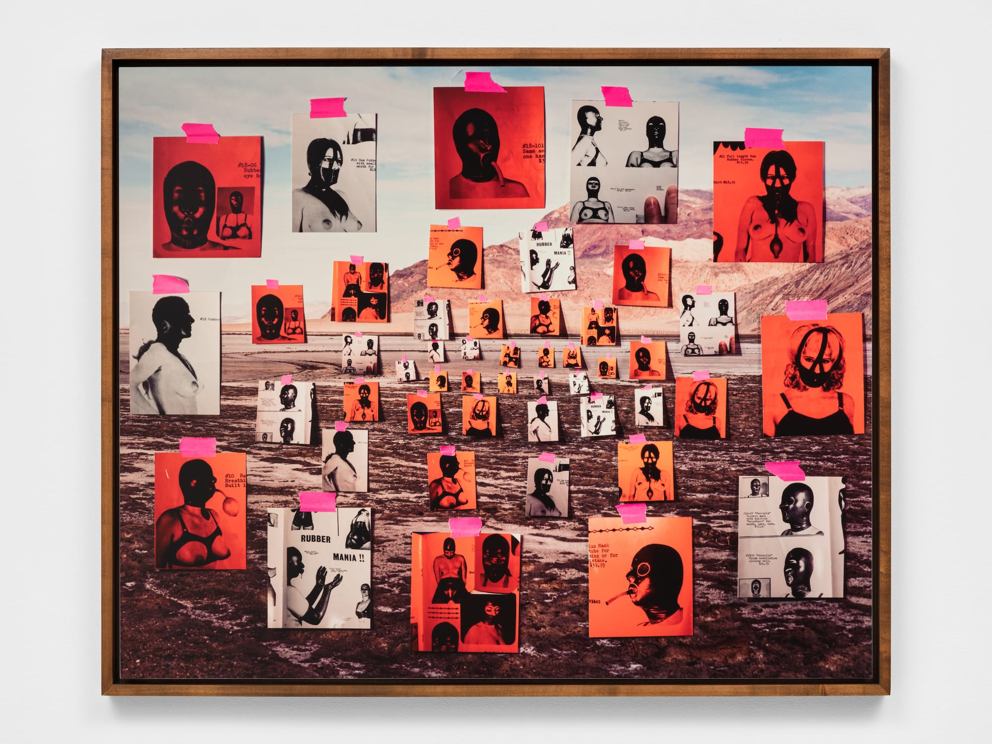 The traces of narrative that I could tease out from the jpegs I saw of Palmer’s work did not quite cohere, nor did they dissipate with time, which intrigued me enough to contact her. In “age of earth and us all chattering” (2022), ads for BDSM hoods and head harnesses are affixed with strips of magenta tape to a view of a mountainous desert. A perimeter of larger photographs encircles smaller ones. Some of the ads are orange-red, while the others are the grayscale typical of cheaply printed catalogues.