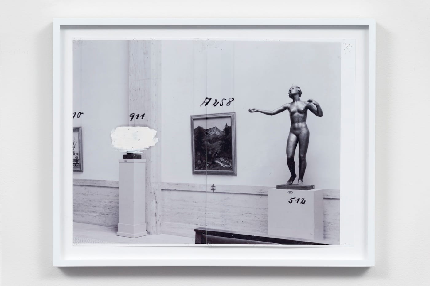 Using archival evidence of National Socialist art exhibitions as his photographic source, Brauntuch tweaks this material, exposing, so the Petzel handout says, “the ease by which information in sensitive archives can be manipulated and referenced at later points in time, as truth.”