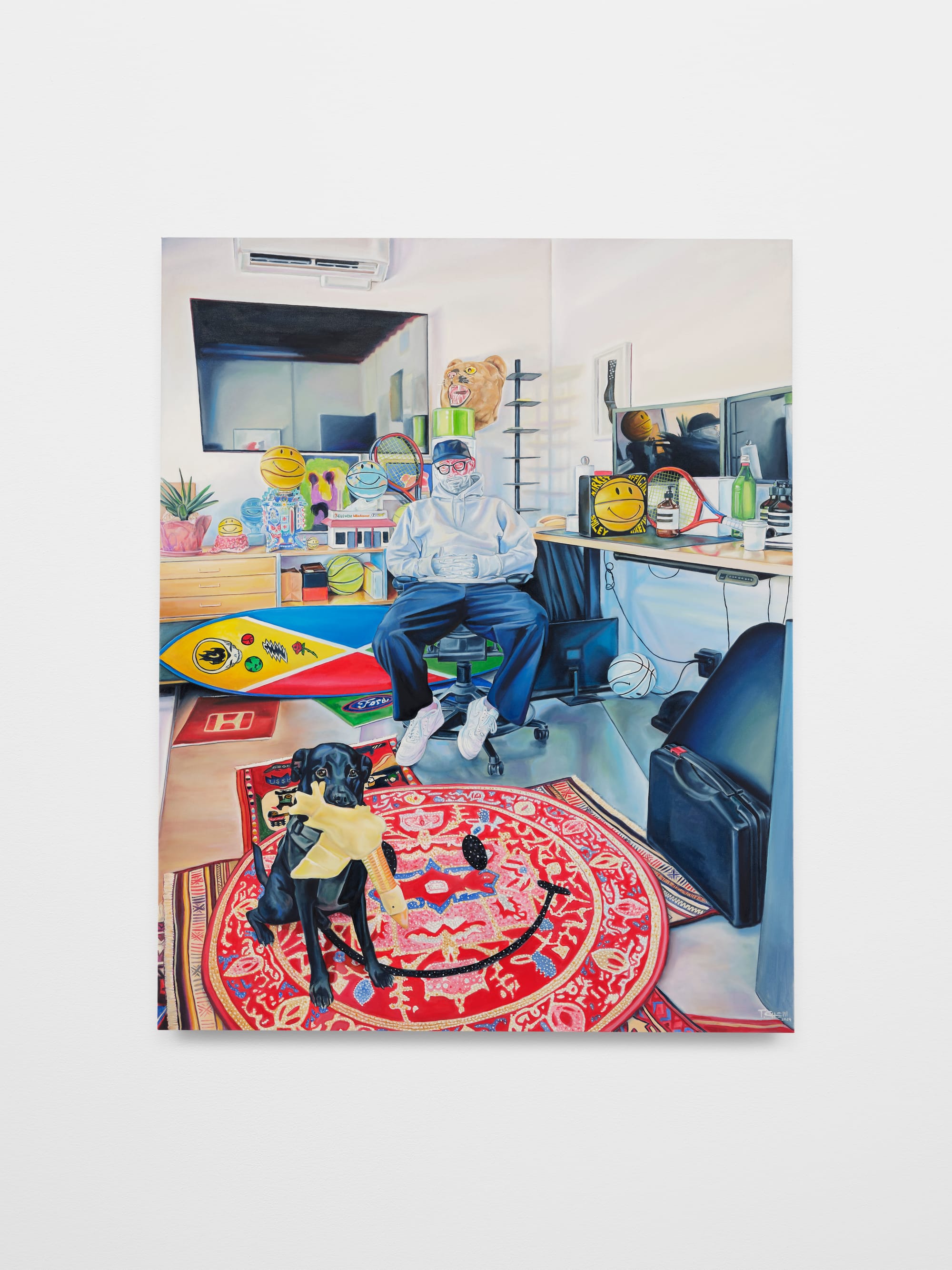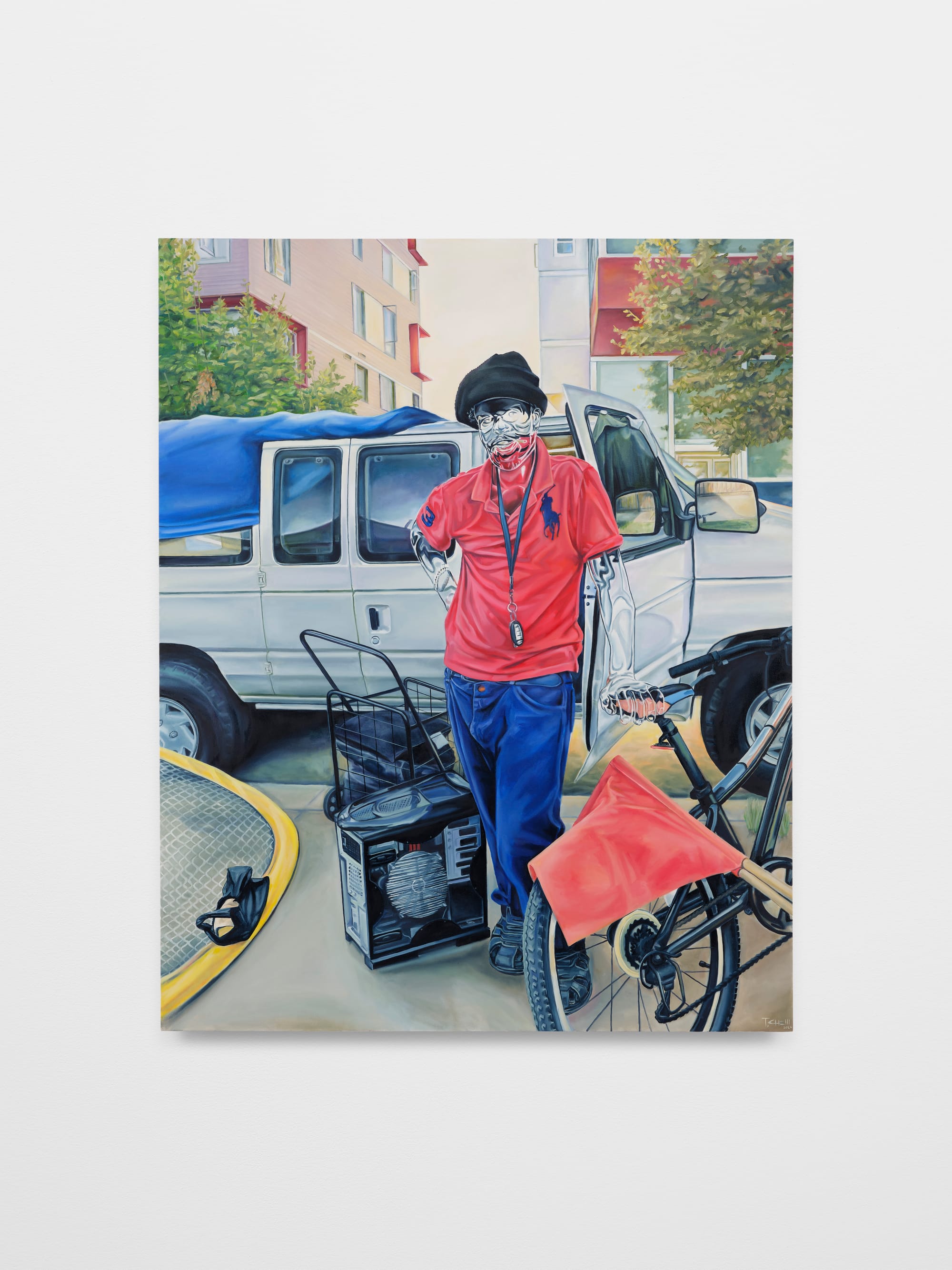Murky areas amidst careful detailing can be found in many of the works. “Hold the blocc down,” for instance, features an unclear object at the lower left — perhaps the edge of a tent — hinting, along with a small array of surrounding possessions such as a bike and shopping cart, at life lived on the street. The car behind the painting's subject, partially seen through his translucent head, seems as much shelter as vehicle, with a tarp covering much of its roof.