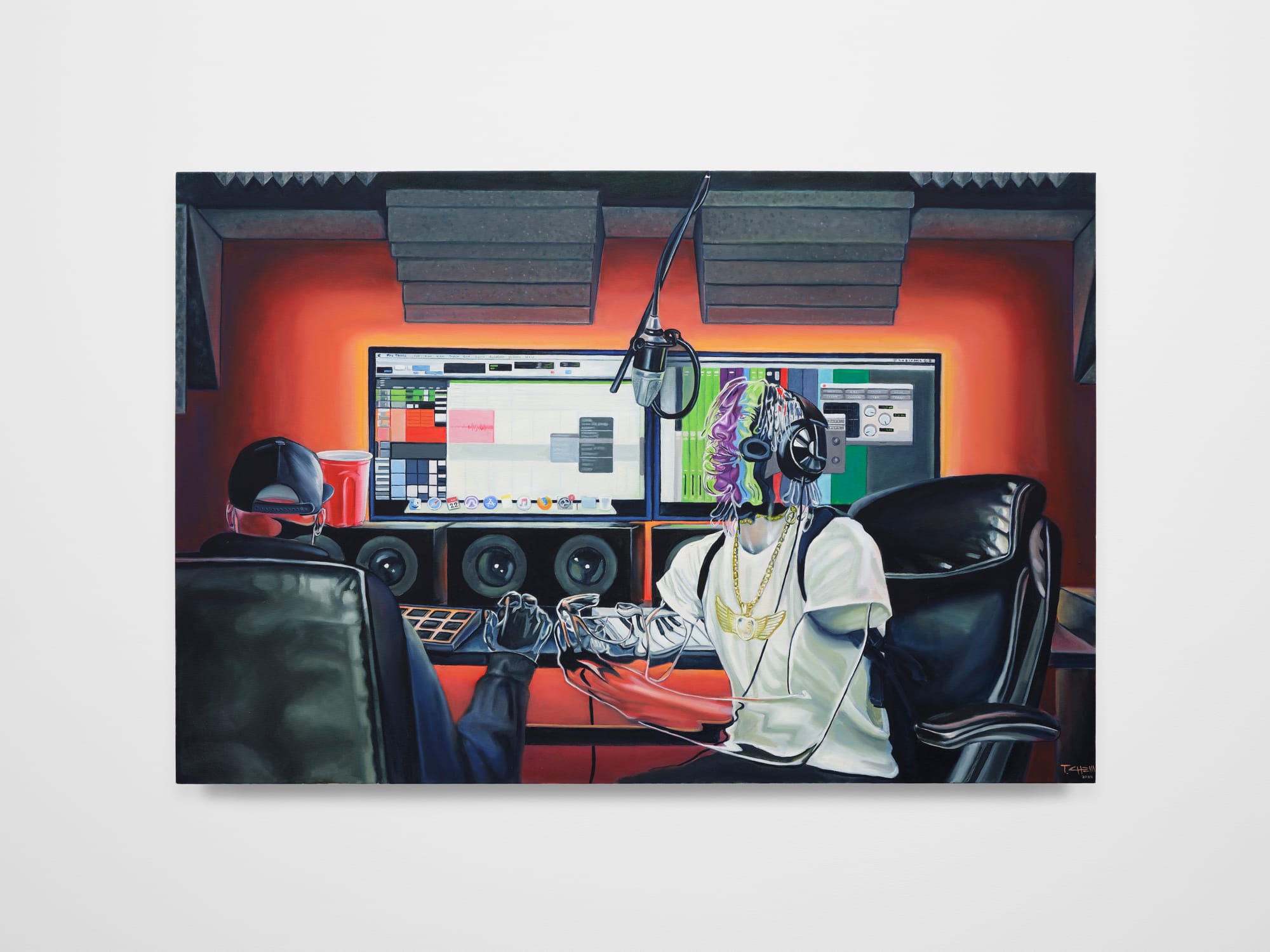 In “Sweet Lullabies,” the saturated almost-rainbow palette of a computer monitor’s read-out bleeds through and highlights details of a singer’s face in a recording studio. His arm extends ever-so-slightly toward the foreground of the painting, his fingers tensed with a kinetic engagement that contrasts with the languidness of the figures in most of the other paintings. While the stillness of those people suggests not simply waiting but the fundamental suppression of vitality by their circumstances, the singer comes alive with the signs of his musical performance — one instance where cultural forces allow personal expression to shine through.