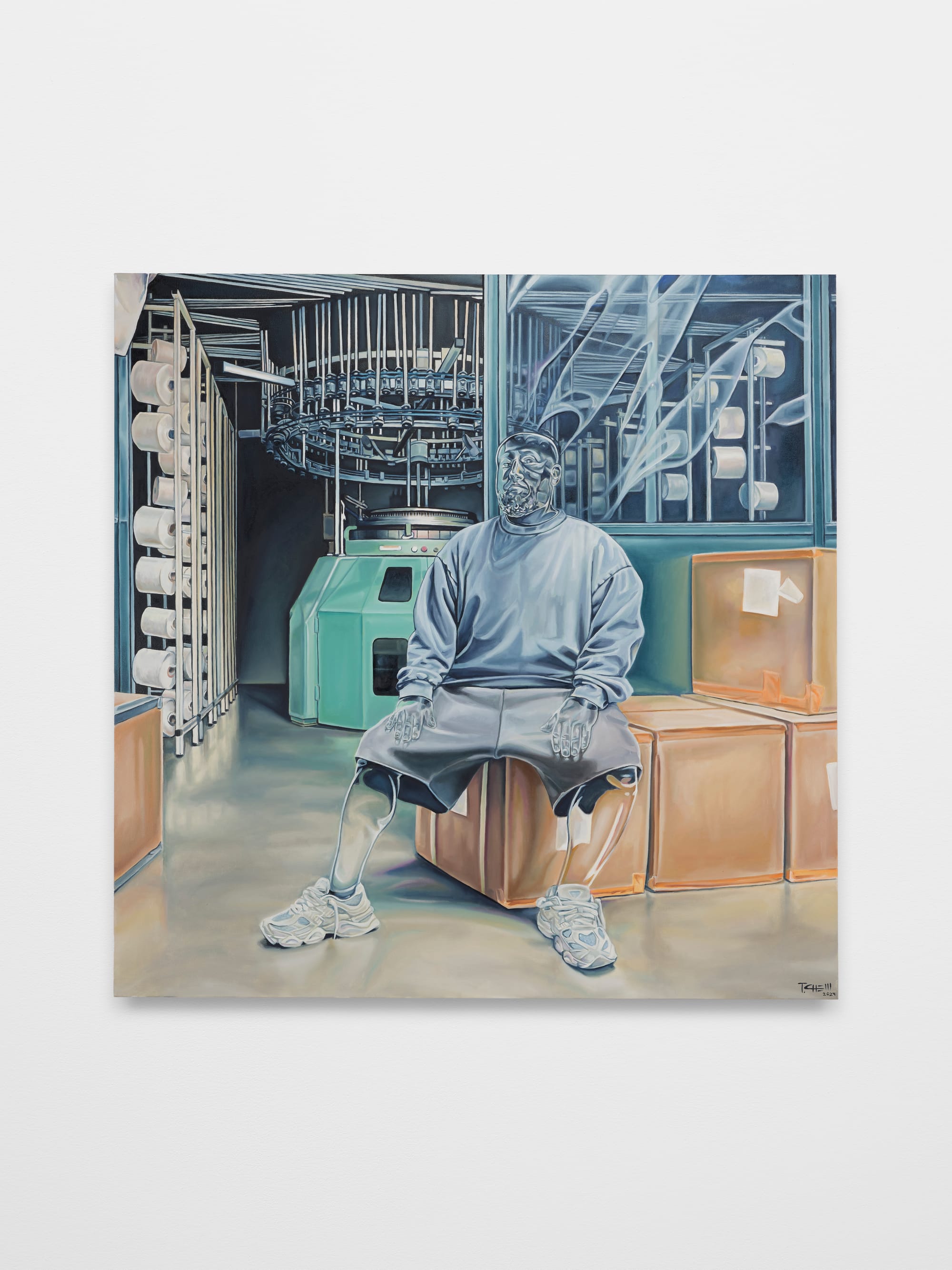 Seen through the faces and limbs of human figures, workplaces and living quarters — including the streets — and their associated ephemera emerge as the structural presences that supersede most other elements of individual personality. In “The T-shirt Pusher” (all works 2024), for instance, the details and surfaces of machinery in a small vintage factory are rendered clearly and precisely in the near background, except in one location: The translucent head of a lone figure, seated in the foreground on a stack of shipping boxes, muddles and distorts both machinery and human visage.