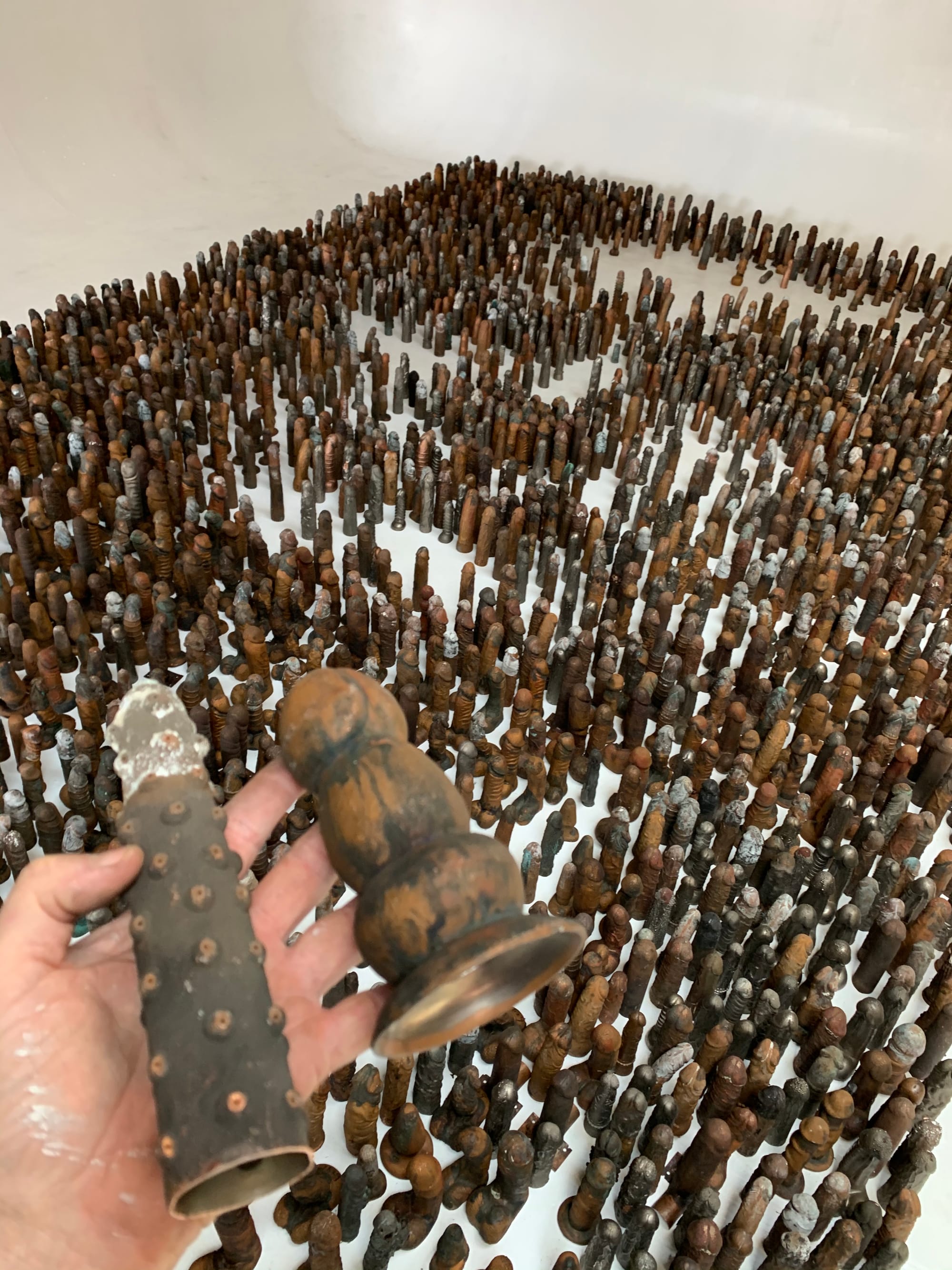 For many artists, the practice of making is the serendipitous combination of subject and medium, hopefully in ways where each informs and amplifies the other. Never has this been more true than in the case of Cleveland-based public artist and designer Stephen Manka, who has used a treasure trove of 2,020 vintage metal dildos purchased from a scrap dealer to render a large-scale portrait of Donald Trump — or, as he will now be known, SCROTUS.