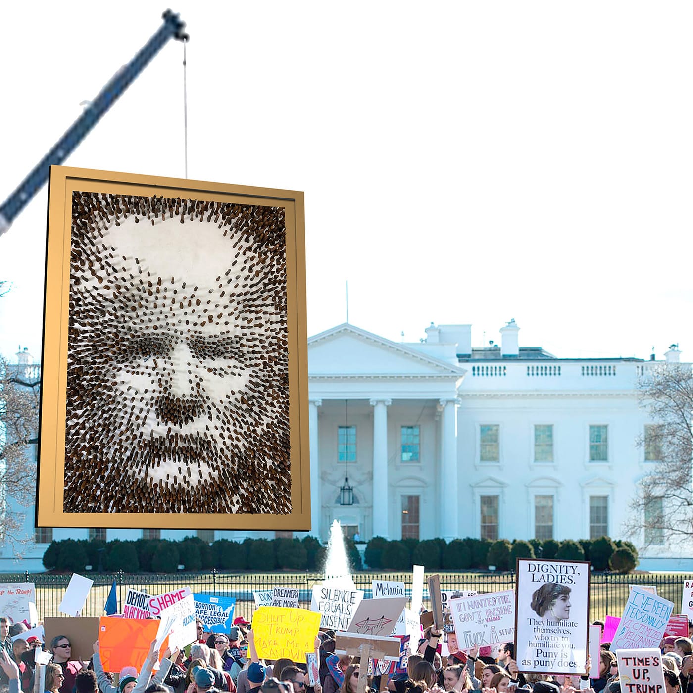“I envisioned a large vertical portrait depicted with dongs and a gilded frame, with Kickstarter necessary to fund it,” says Manka. He calls the portrait a “new direction” in his art practice, “merging photography, sculpture, found objects, and a charged political position.”