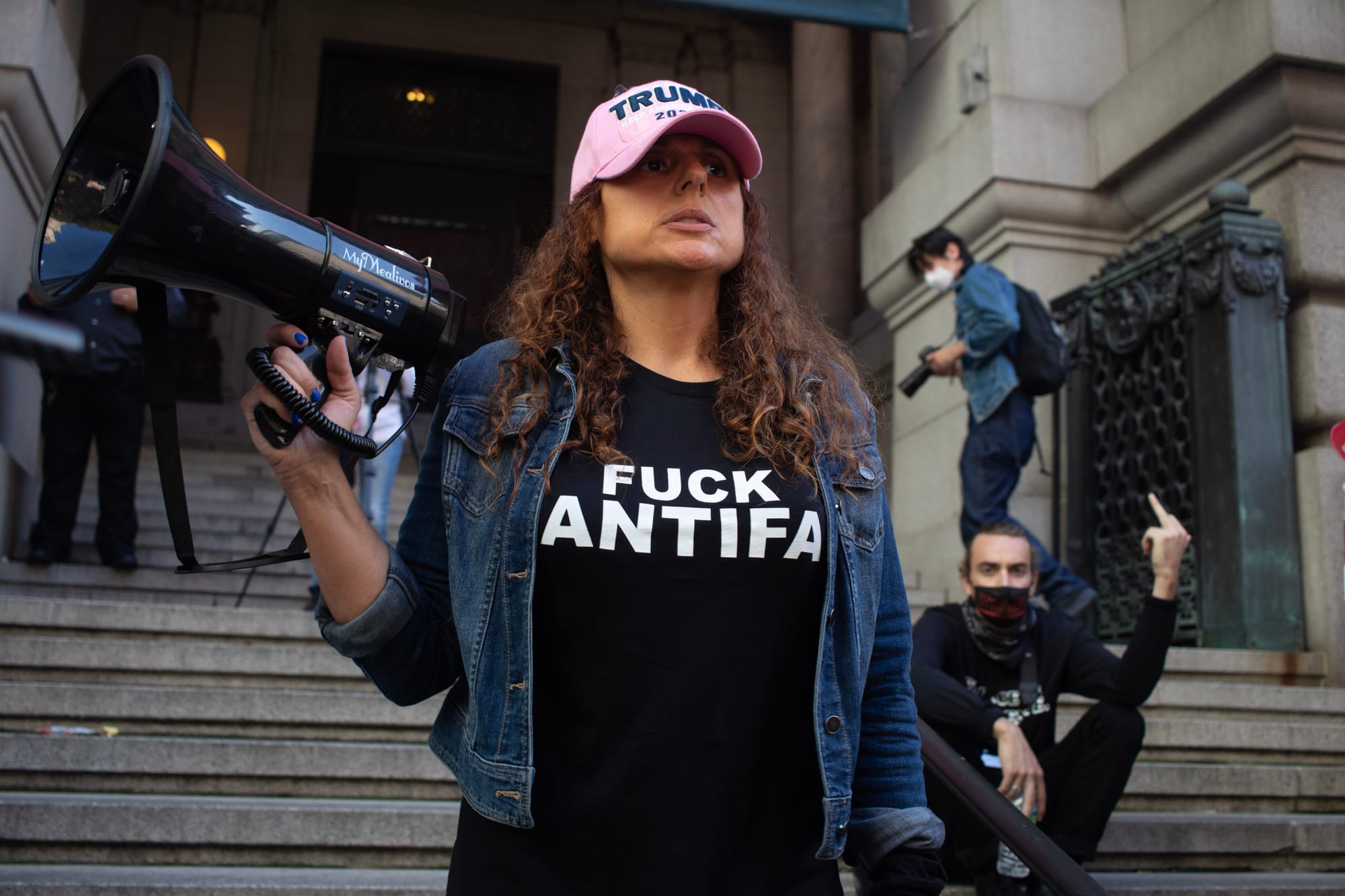 Members of the activist photography collective NYC Protest Coverage who documented the rally told Hyperallergic that minor scuffles erupted between rally participants and counter-protesters from the left.