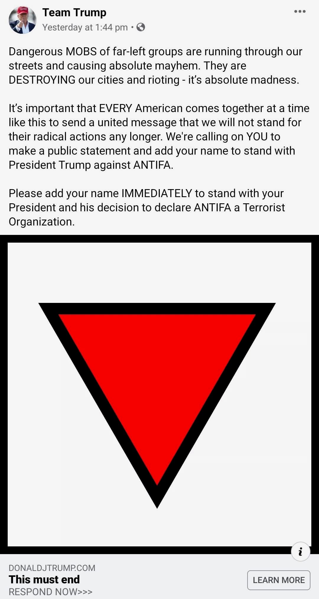 For a short while on June 18, the Trump campaign published a Facebook ad calling for supporters to take a stand against “dangerous MOBS of far-left groups” and to sign a petition declaring Antifa a “terrorist organization.” Accompanying the call to action was a large, inverted red triangle. As those familiar with Nazi imagery and the history of World War II recognize, this same symbol denoted “political prisoners” within the concentration camps of Nazi Germany. While many may know about the use of the yellow Star of David, there were in fact many symbols use to mark various types of political prisoners: Jews, Gypsies, those imprisoned for sexual orientation, Jehovah’s Witnesses, and many more each had their own symbol assigned within the classification system for the camps.