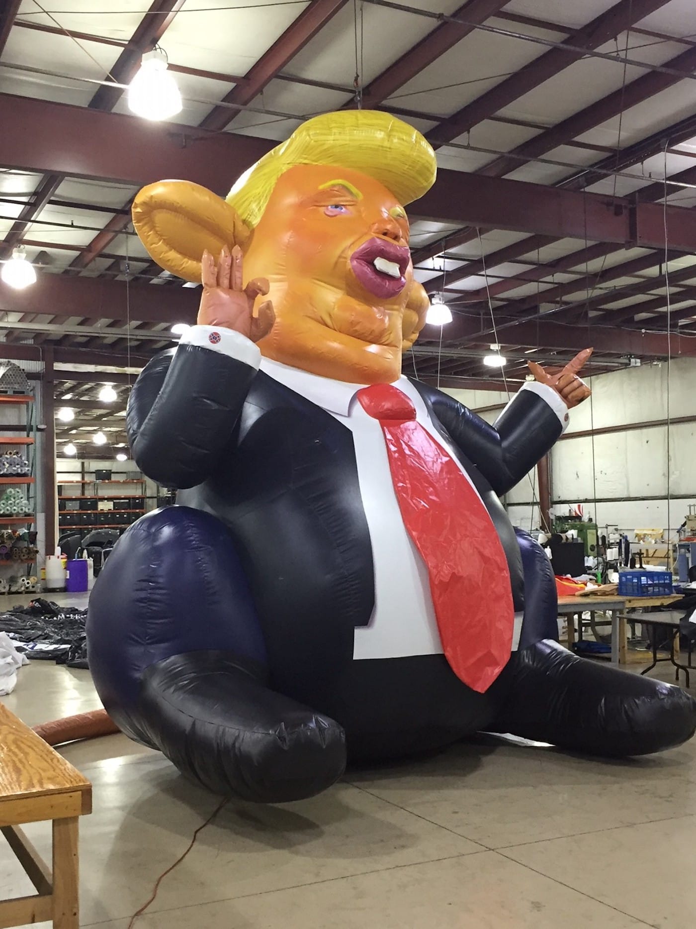 While the original design portrayed a rodent with a comb-over and dressed in a suit and extra-long tie, the finalized inflatable is unmistakably Trump. He’s more human-like, with an orange face that features a squat nose, small eyes, large ears, rippling chins, and very plump lips. Plus, his hands (which are small) form some of the President’s favorite gestures, from the air pinch to the finger point.