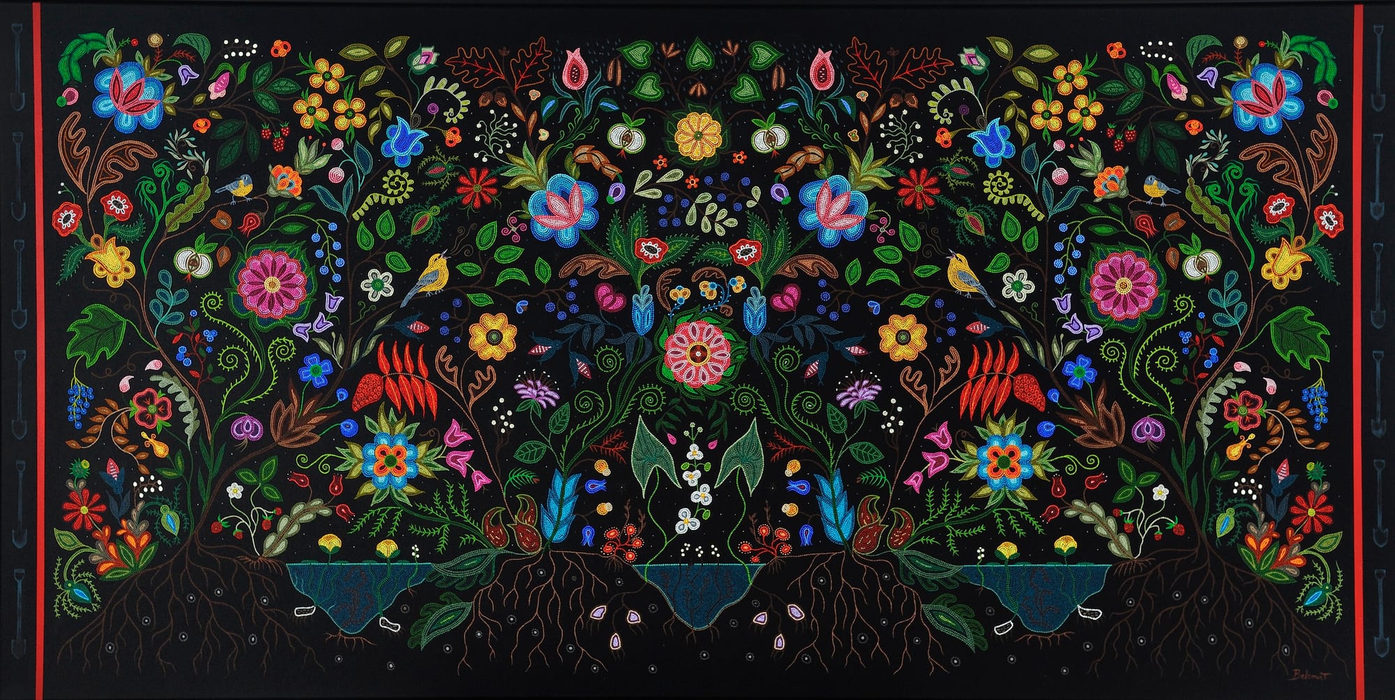 With these works, Indigenous artists reclaim realities long denied them by US and Canadian federal governments — including moments of collective reverie. Christi Belcourt’s kaleidoscopic paintings bring this latter element to the forefront, grounding images of colorful foliage with deep, visible roots. Pieces such as “So Much Depends on Who Holds the Shovel” feel both ornamental and spiritual as brightly hued birds and flowers radiate ancestral truths against a black background.