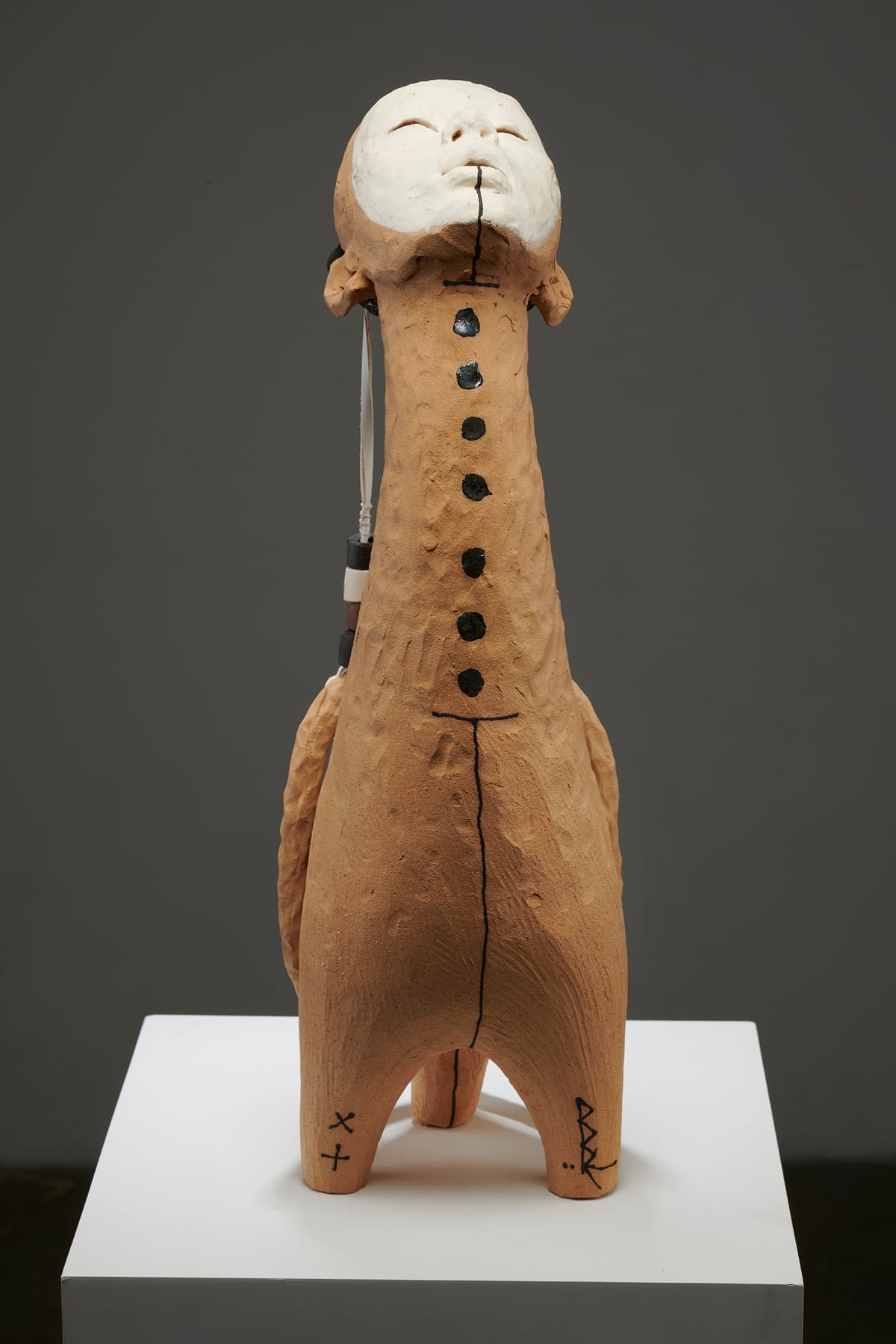 This confrontation with the colonial gaze informs much of Truth-Telling, which alludes to direct attacks on Native communities. Rose B. Simpson’s regal sculptures capture the creative labor of Indigenous women, whose murder rates are 10 times higher than the national average. In “Reclamation III: Rite of Passage,” a hairless woman with a gaping hole in her chest forms the foundations of a rounded clay pot. Simpson’s sculpture “Breathe” likewise show a woman’s head held back with mouth agape, as if silently screaming. Together, the emotionless gaze of both works evokes centuries of bureaucratic neglect.