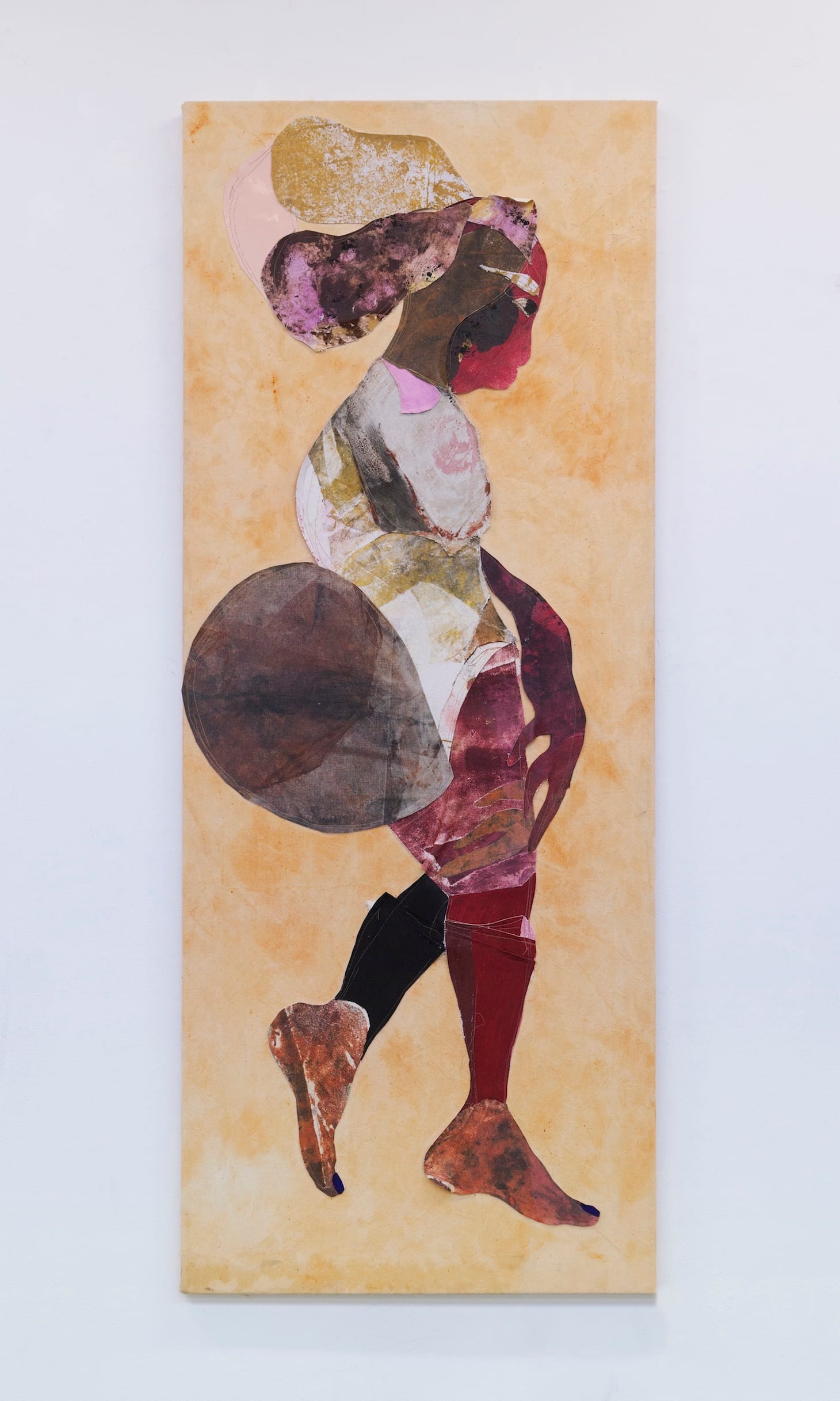 Several spirited moments animate the wall installation’s relative symmetry. One of these is the rectangle that floats across the bottom of the stretched canvas with the yellow background. This floor pattern is a shorthand way to suggest a domestic interior. It informs the visual narrative, just as knowing that Self, a 31-year-old Black woman, was born and raised in Harlem, New York, in a family of five sisters and one brother informs and personalizes her work.