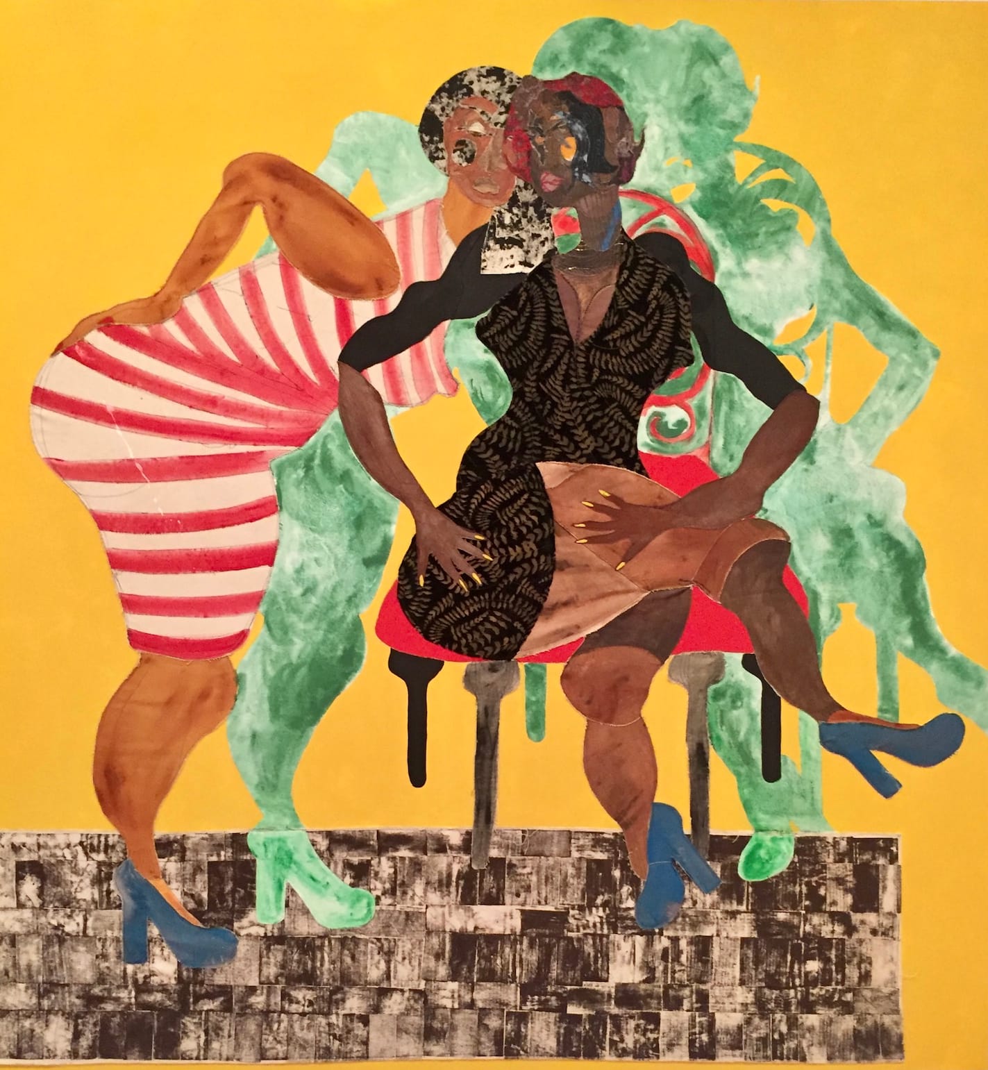 “Two Women 3” is the most anomalous composition of the exhibition’s triptych. It’s the loosest, looniest, and, despite the hushed tones of its secret-sharer, it’s the loudest visually of the three canvases. The larger-than-life friends sport matching blue heels and flash their fashionably painted fingernails. Comfortable in their imperfections, the women flaunt their ample curves.