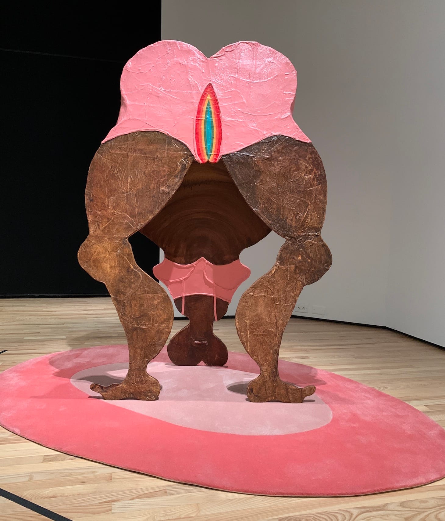 Art history plays a role in the lead-up to the painted installation described above. When viewers approach it they have to walk around the museum’s intertwined “The Three Rings” (1966) by Henry Moore. The marble curves prefigure the round-as-earth buttocks of Self’s collaged “characters” (the artist’s word of choice for her spunky figures).