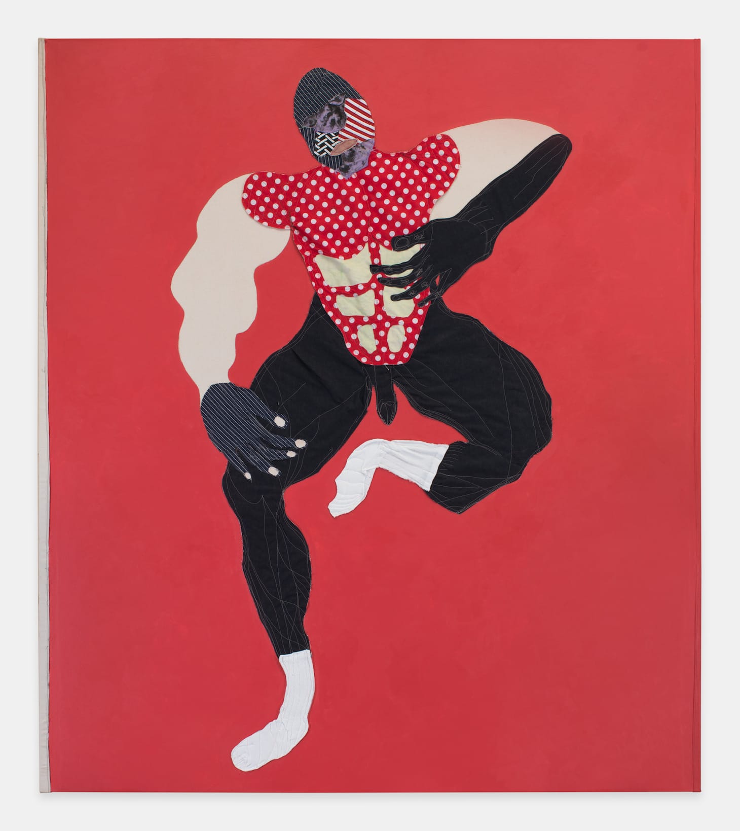In her studio she is bold. From one project to the next, Self reinvents herself and reimagines how to portray the human body. The genitalia of “Loner” has little in common with that of the cheeky contortionist revealing herself in the pink two-piece (“Rainbow Bronze,”2021). And the penis of the red-and-white polka-dotted torso of the he-man in “Sock” — his sewn knuckles adding a refreshingly dainty twist to his pumping-iron body — is shaped and sized differently than its bigger, wrigglier counterpart in “Horse” (2018).